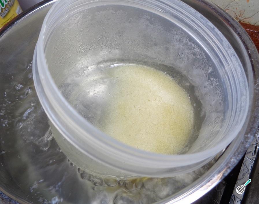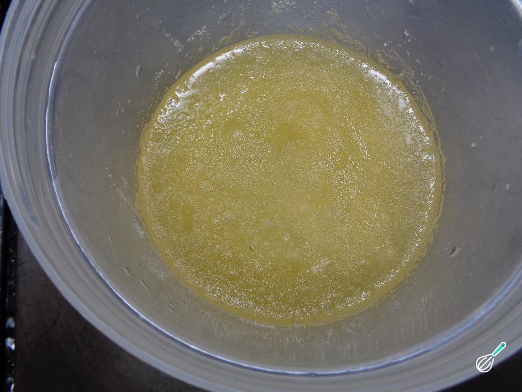 Para continuar com a preparação da mousse de manga, misture a gelatina sem sabor com a calda da manga. Reserve a preparação por um momento para hidratar por completo, durante aproximadamente um minuto ou dois.