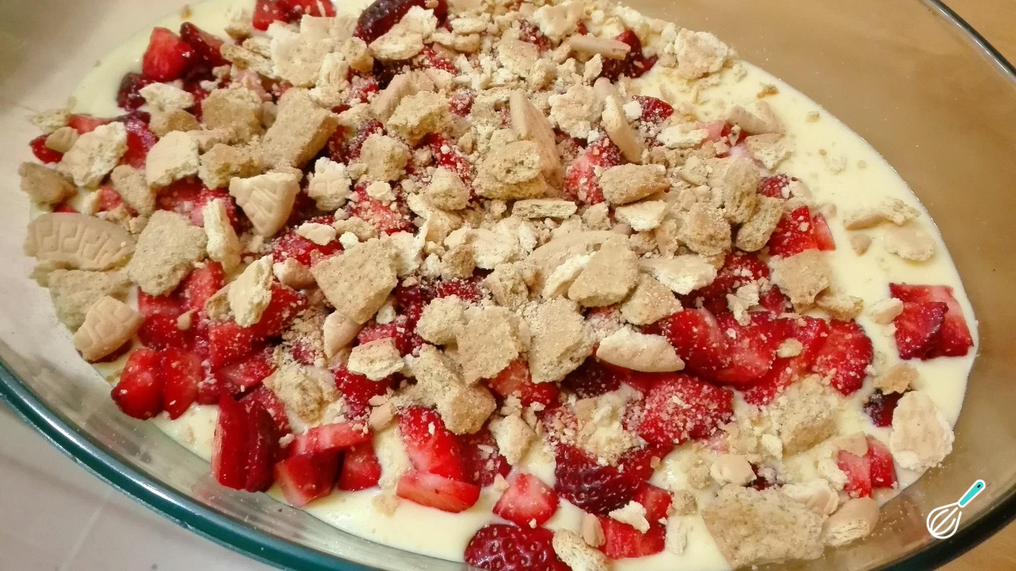 Lave os morangos, retire a parte verde e corte em fatias ou pique, reservando alguns para decoração. À parte parta os biscoitos grosseiramente com as mãos, coloque em um saco de plástico e bata com o rolo da massa, para quebrar em pedaços menores.