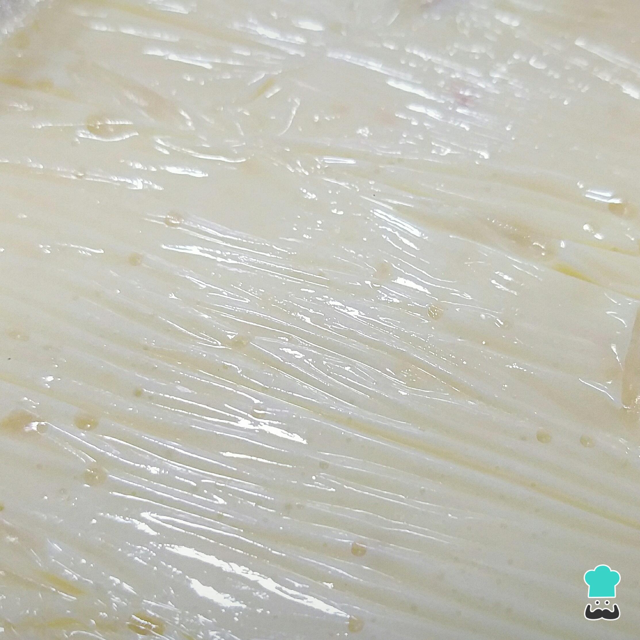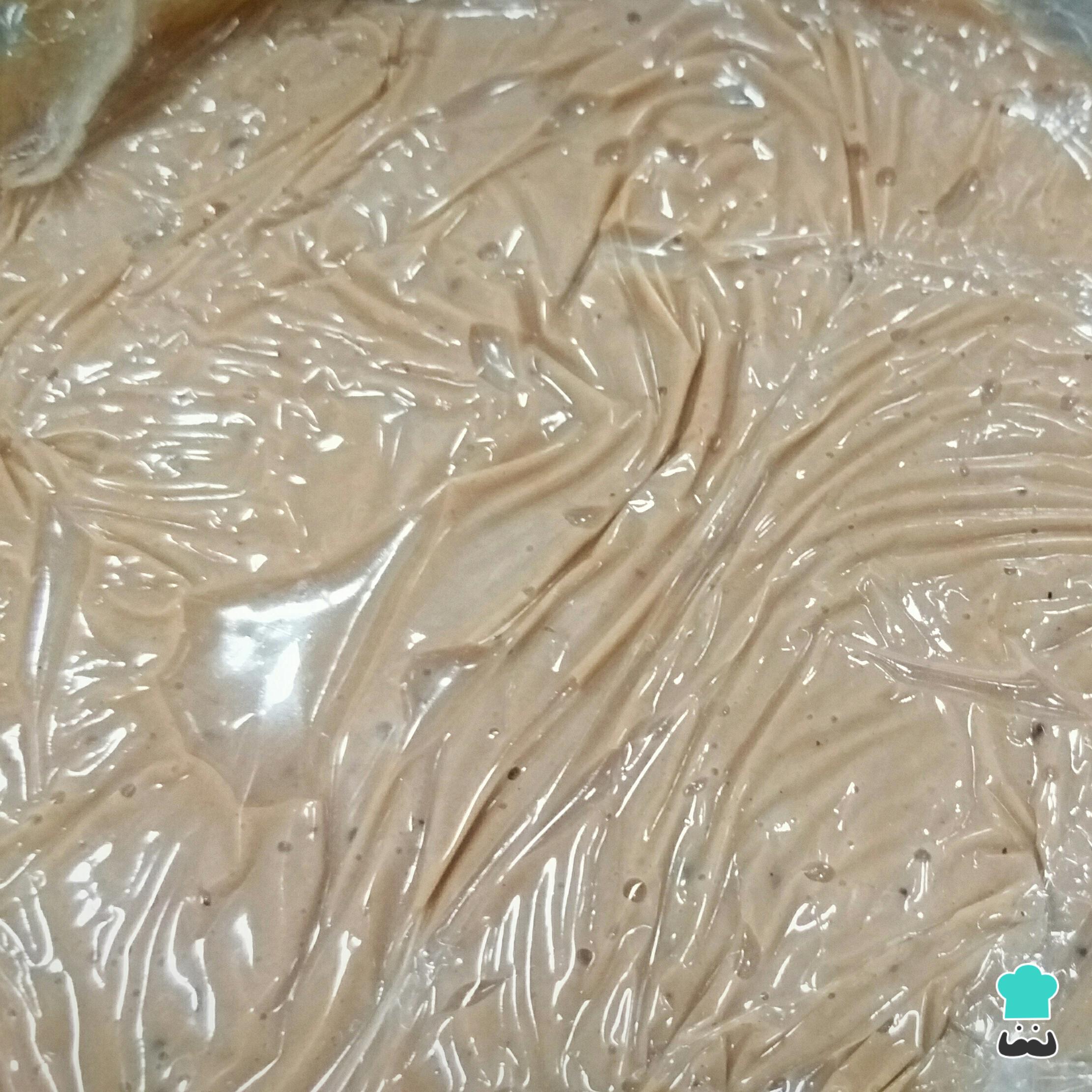 Cubra as vasilhas com papel filme transparente (PVC), de forma a encostar diretamente nos cremes. Isso evita a formação de uma camada endurecida no creme.