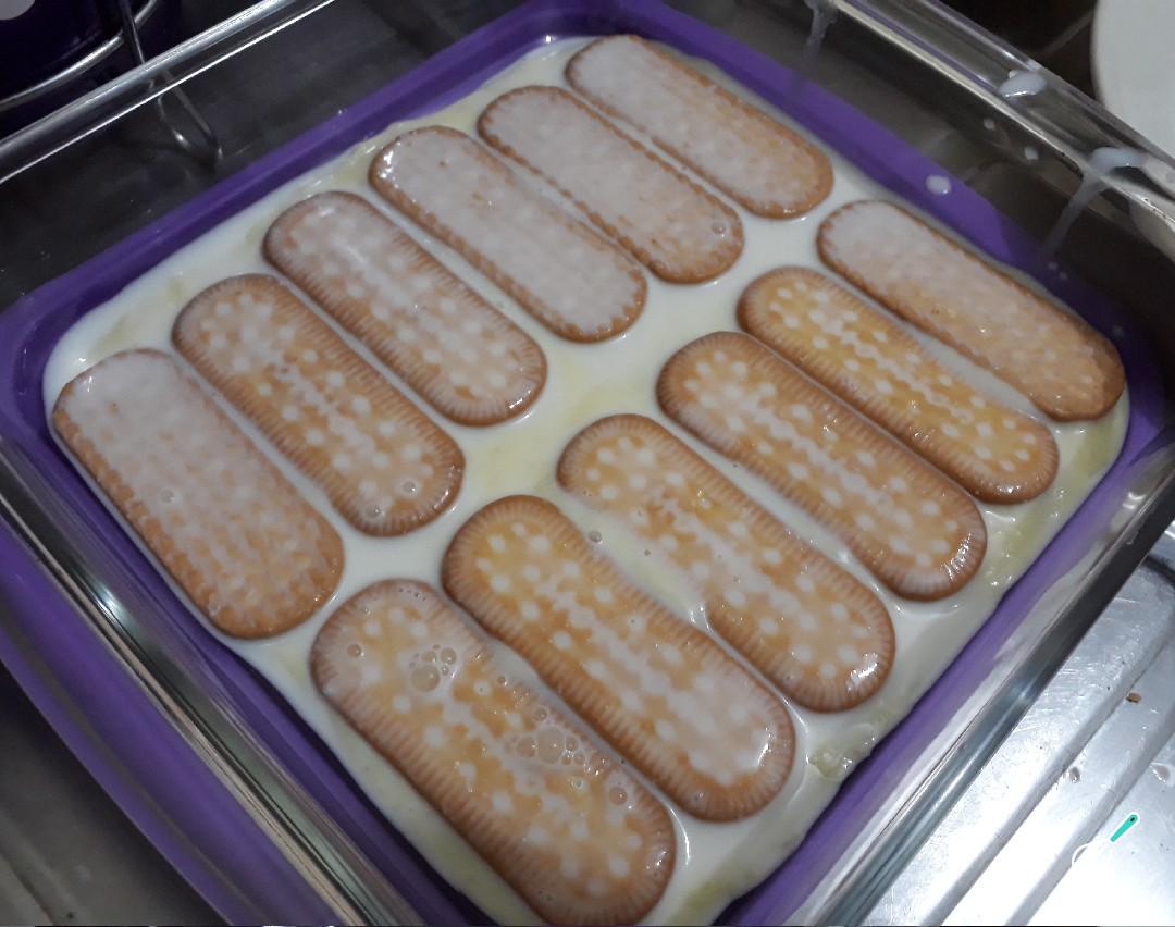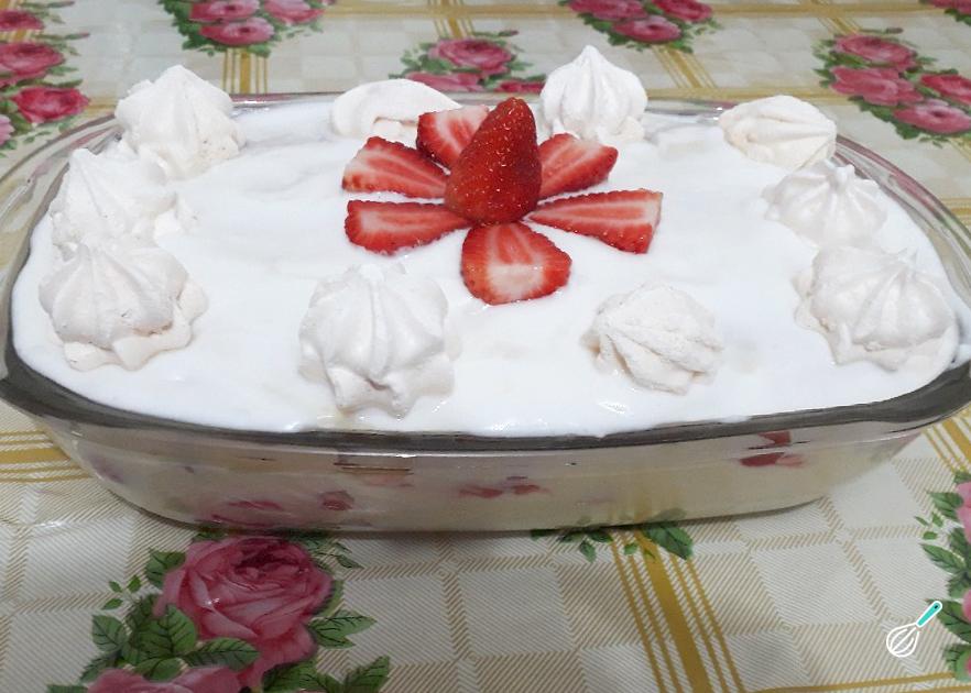 Em uma travessa coloque na seguinte ordem: uma camada de biscoito molhado no leite com açúcar, outra camada de morango picado, metade do creme. Repita as camadas terminando com o creme.