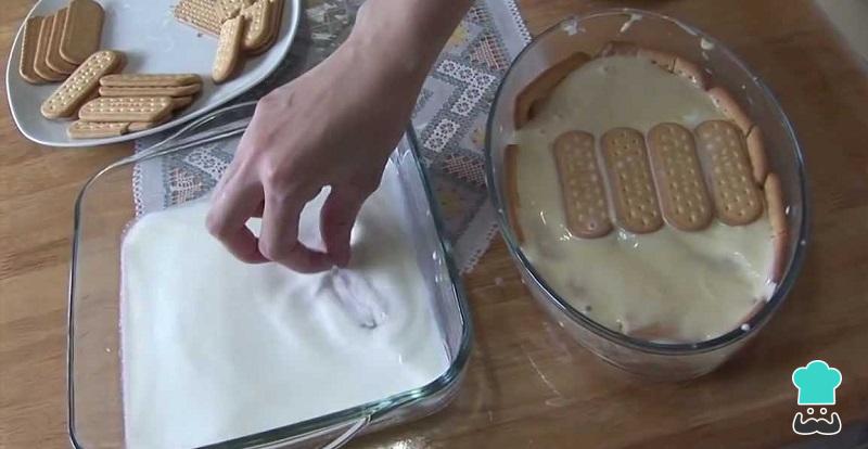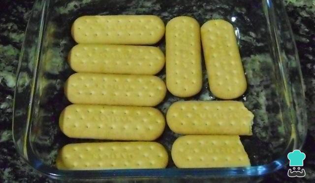 Misture em uma tigela o rum com as 2 xícaras de leite e umedeça alguns biscoitos nesse líquido. Coloque os biscoitos umedecidos em um refratário de vidro, de modo a ocupar todo o fundo.