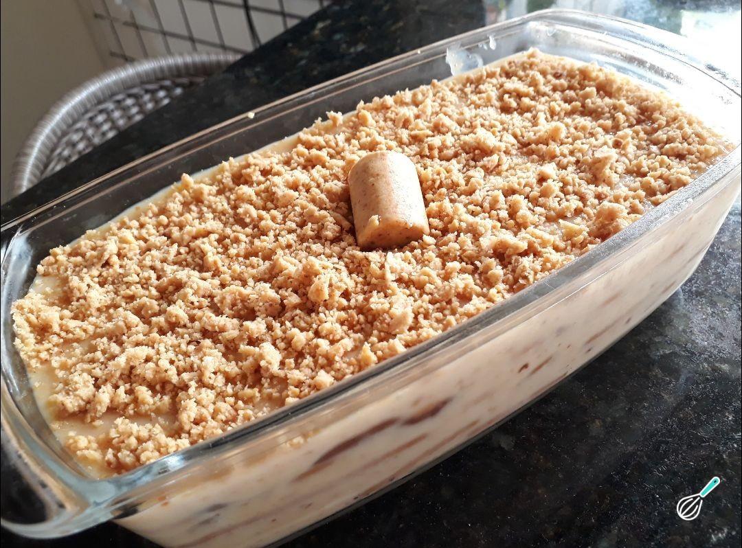 Finalize a última camada com o creme de paçoca. Triture grosseiramente 3 paçocas para a finalização do pavê e deixe uma paçoca inteira no centro, para decorar.