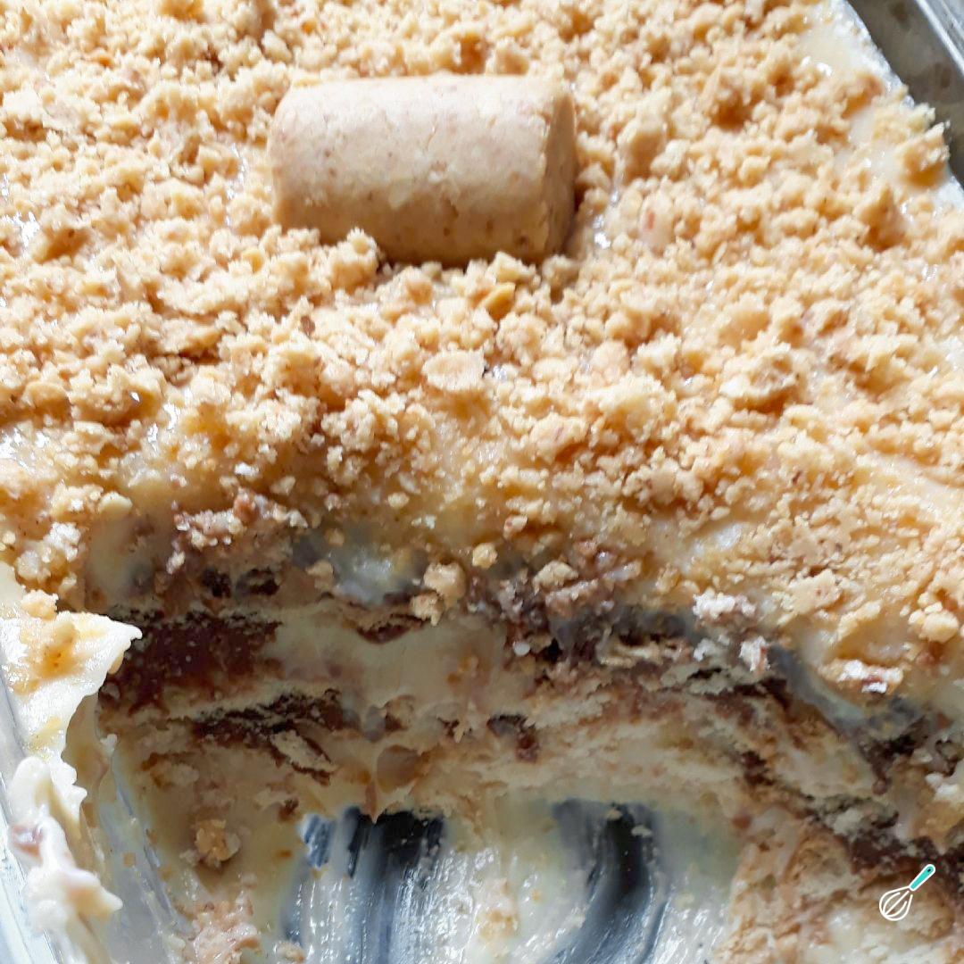 Cubra as bolachas com um pouco de creme de paçoca, espalhe ganache de chocolate meio amargo em colheradas distribuídas pelo creme (como na foto) e repita as camadas até terminar.
