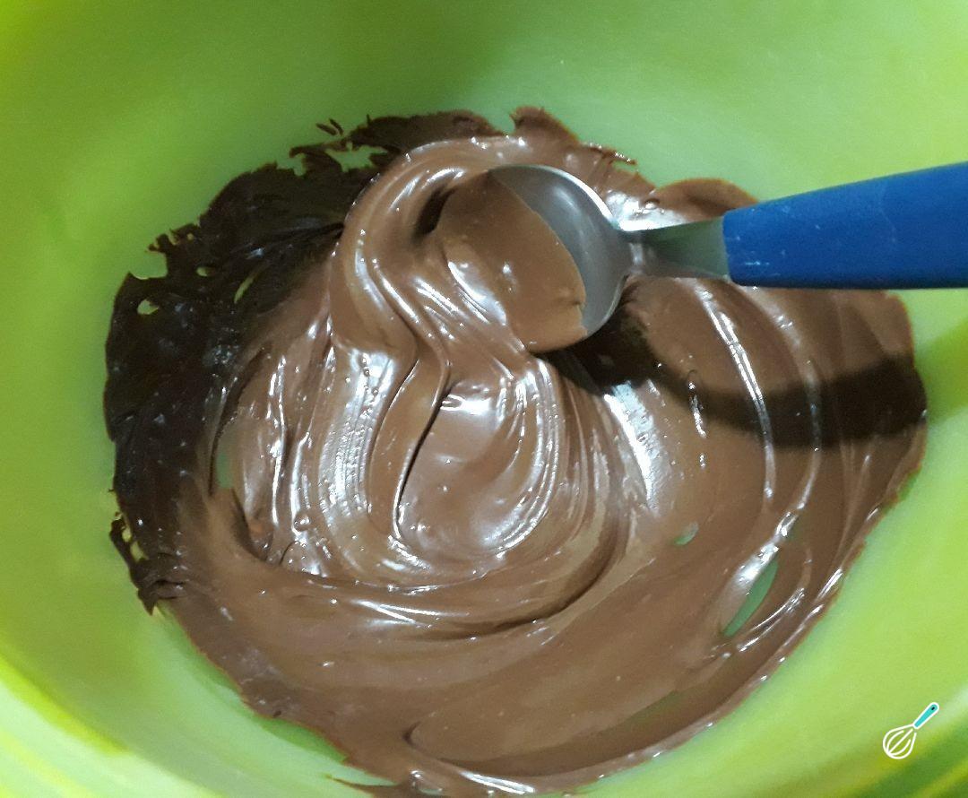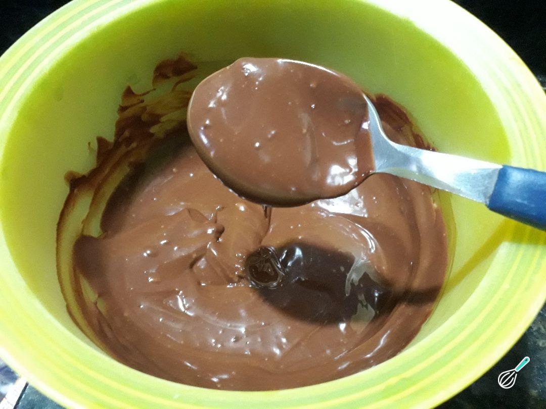 Misture no chocolate o restante do creme de leite (meia lata reservada anteriormente) e mexa até ficar bem homogêneo.
