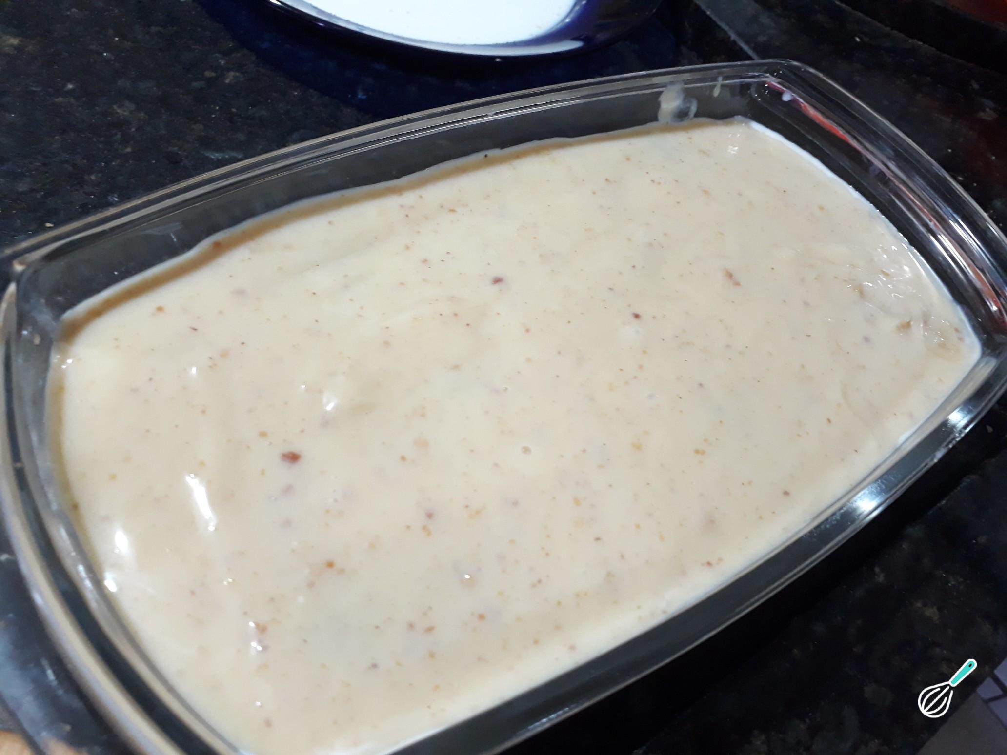 Passe as bolachas uma a uma na calda de leite em pó e água e faça uma camada de bolachas por cima do creme.