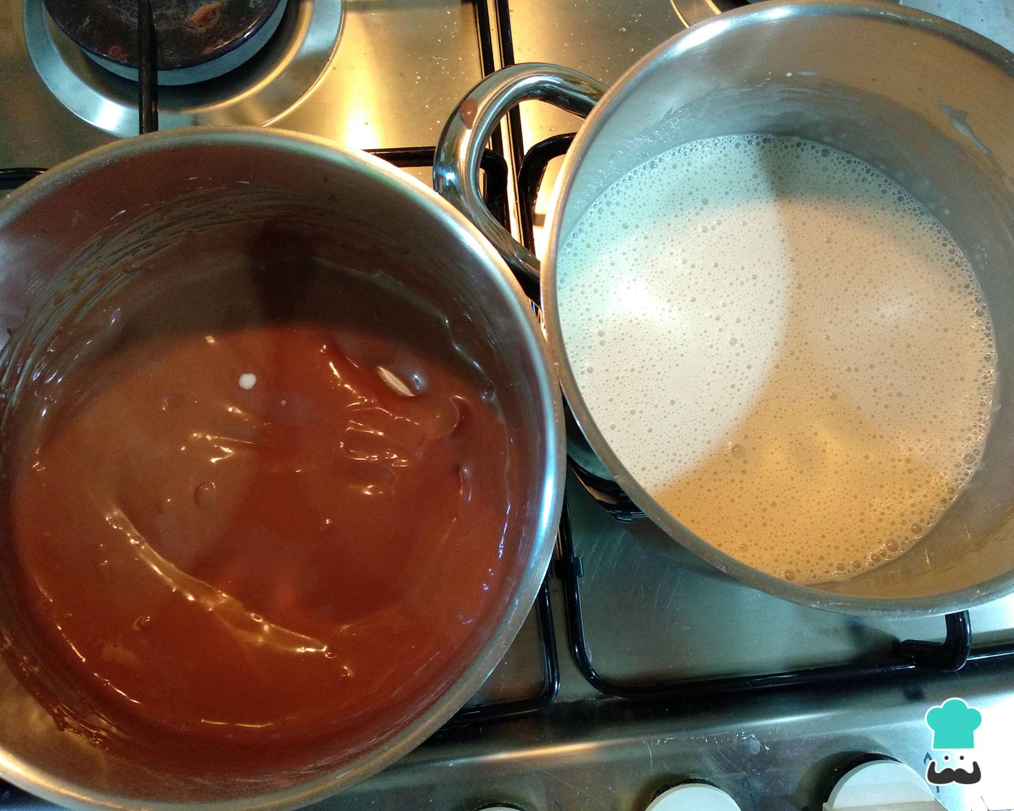 Na panela em que vai preparar o creme de paçoca coloque a maisena e um pouco de bebida de aveia e misture, somente para dissolver a maisena. Noutra panela coloque a maisena, o cacau e um pouco de bebida de aveia e mexa também para dissolver.