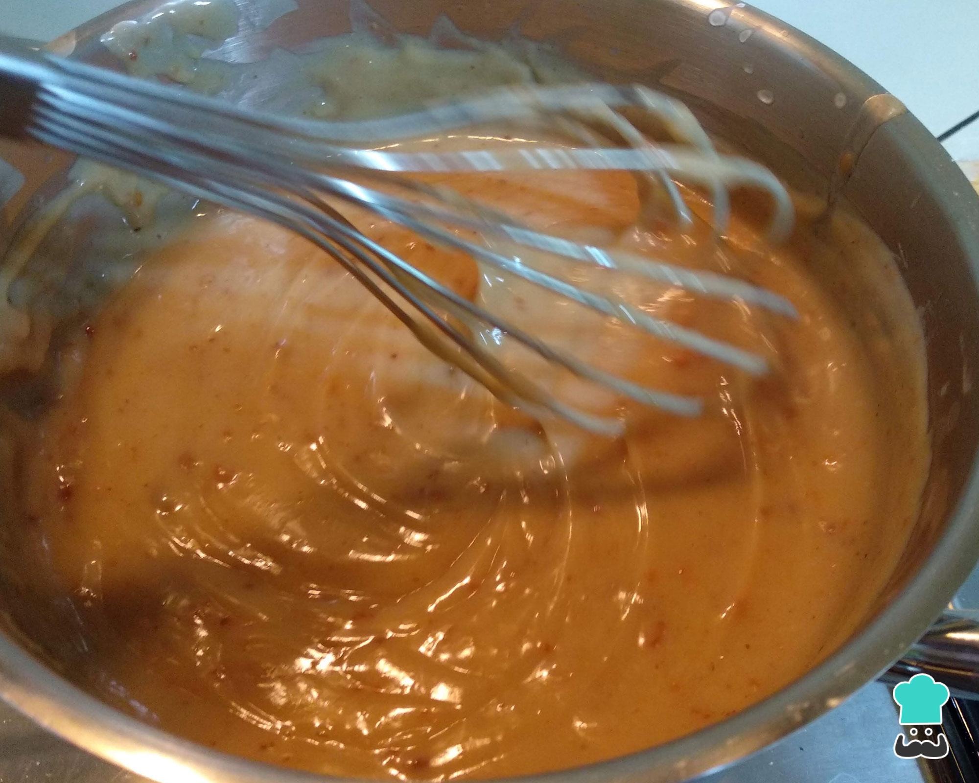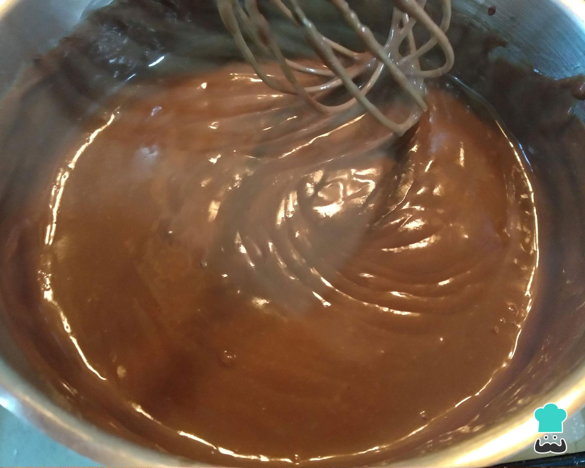 Enquanto isso prepare o creme de chocolate: adicione a restante bebida de aveia na panela e também o açúcar. Leve ao fogo médio e fique mexendo até espessar igual ao creme de paçoca.