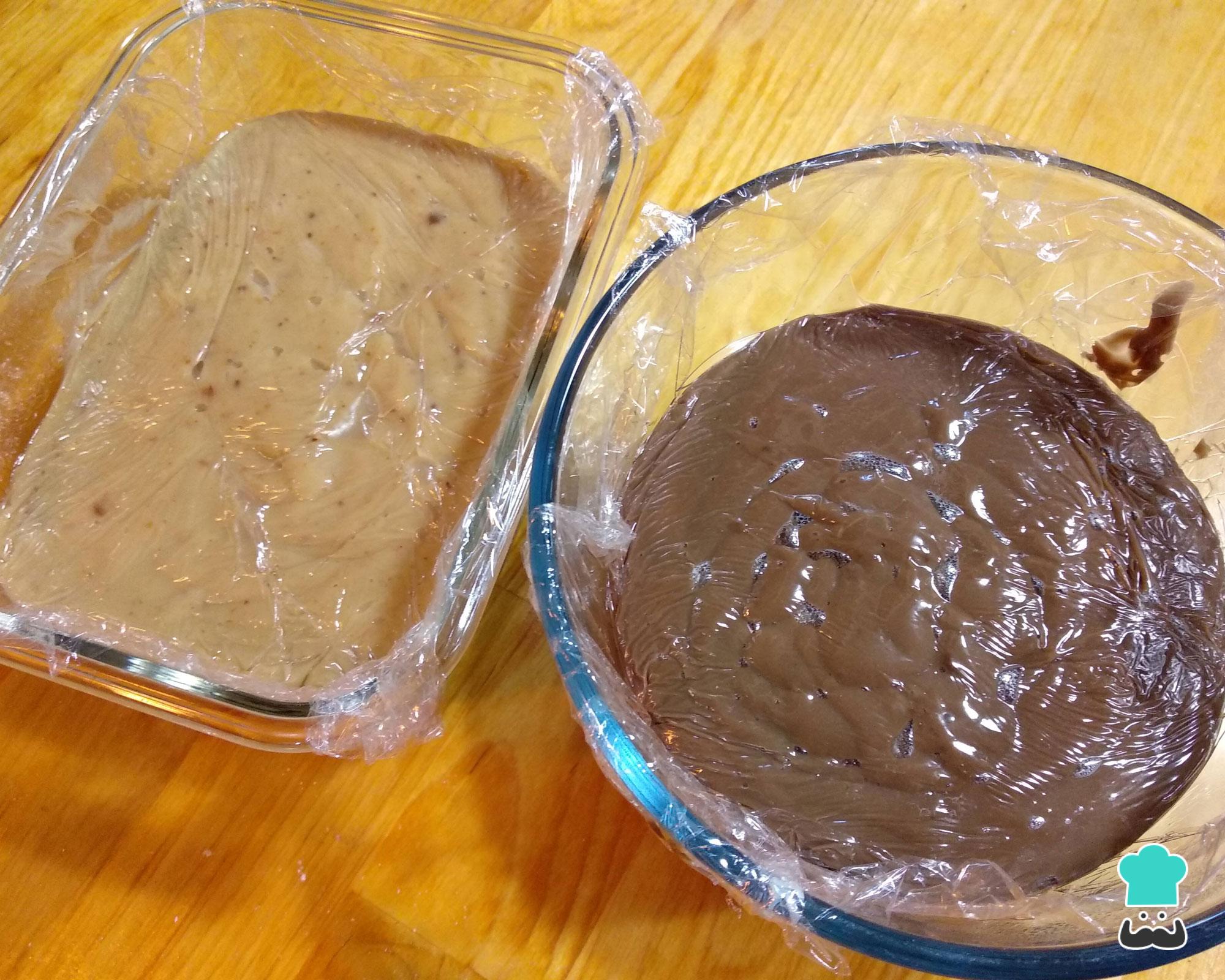 Transfira o creme de paçoca e o creme de chocolate para tigelas individuais e cubra com plástico filme tocando nos cremes, como na foto. Esse é um truque para esfriar os cremes do pavê sem que se forme uma película dura. Deixe na bancada por 30 minutos ou até ficarem em temperatura ambiente.