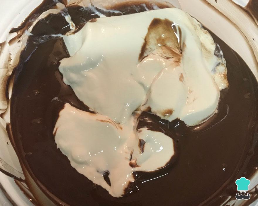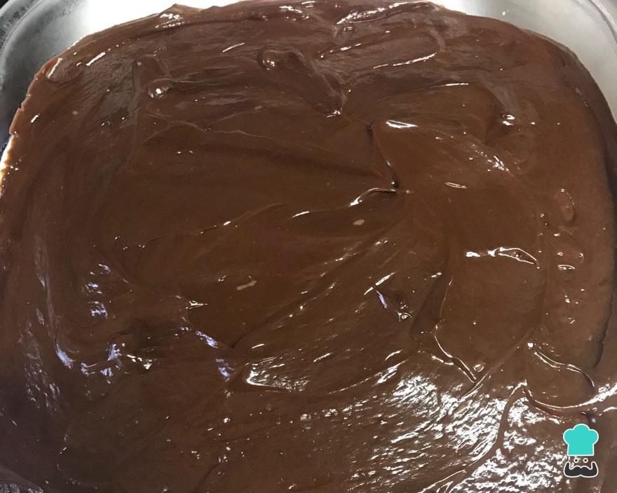 Adicione a outra caixinha de creme de leite ao chocolate derretido e misture até virar um creme homogêneo. Reserve este ganache de chocolate, que usaremos como cobertura do pavê.