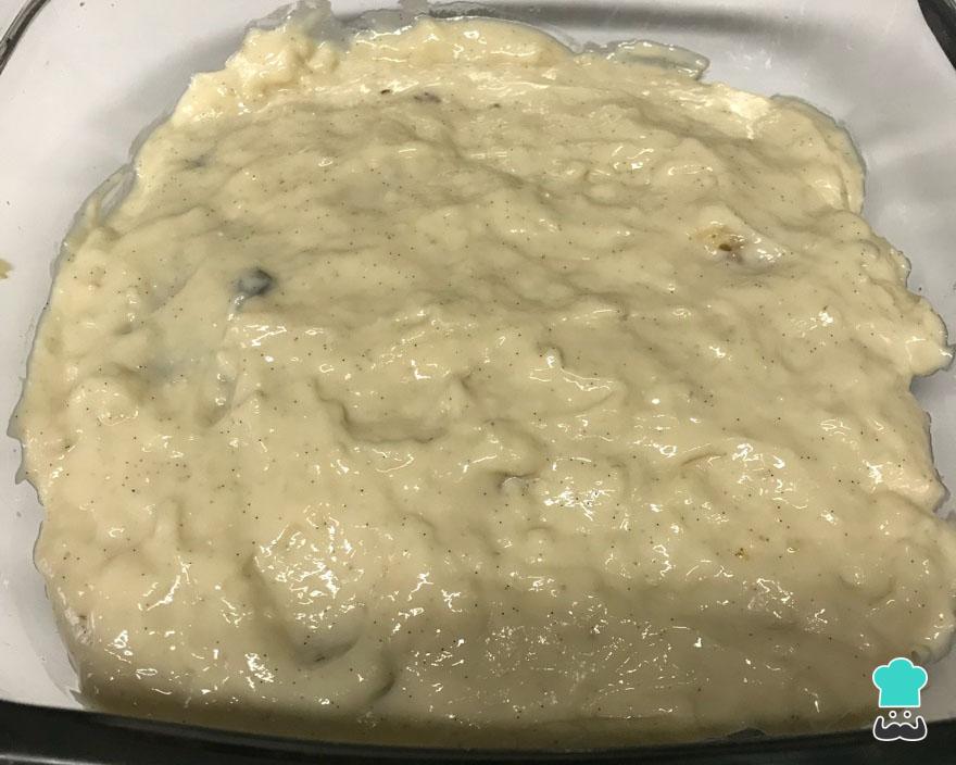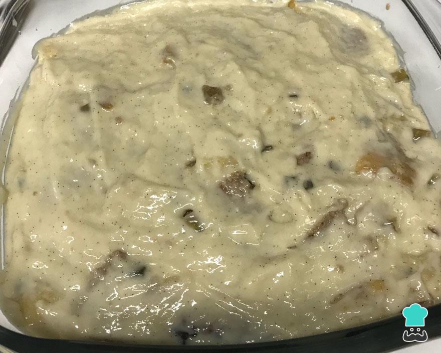 O passo seguinte desta sobremesa de Panetone é colocar metade do creme de baunilha, espalhando bem com uma colher ou espátula.