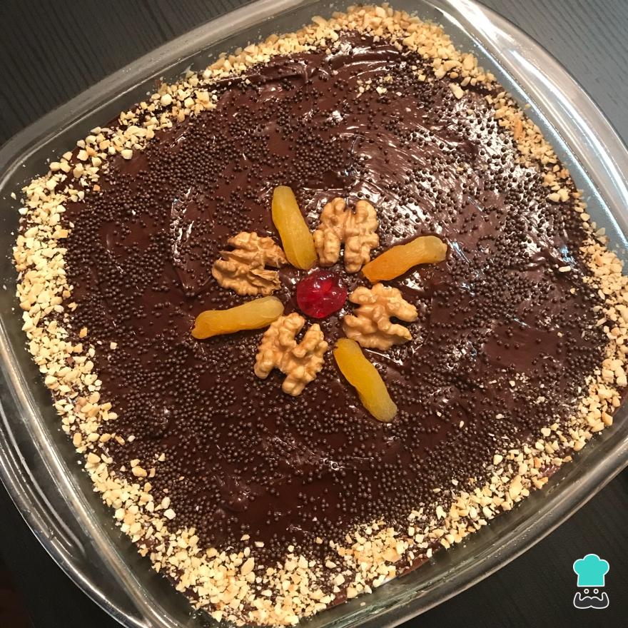 Finalize colocando todo o ganache de chocolate por cima e enfeitando com nozes, damasco e o que preferir. Leve para gelar por, no mínimo, 3 horas - desse jeito o Panetone ficará bem molhadinho e delicioso!
