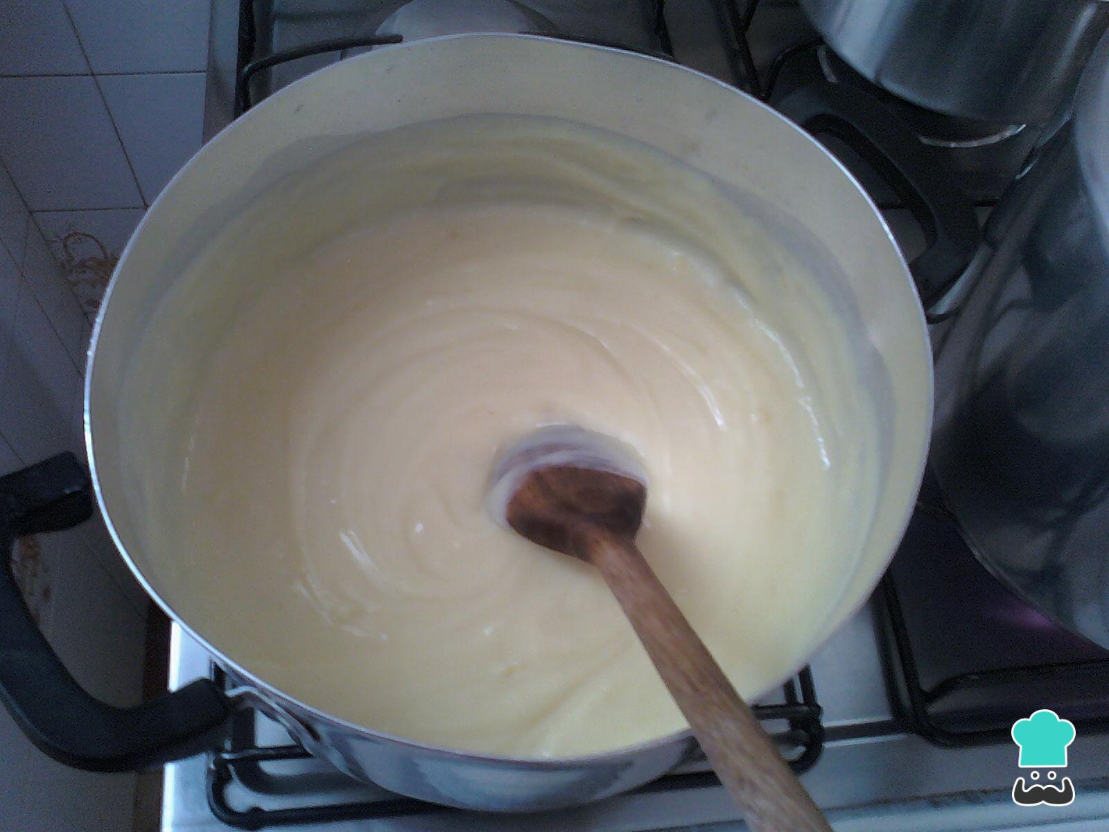Leve a panela ao fogo médio e mexa sempre até se formar um creme grosso. Desligue e deixe esfriar.
