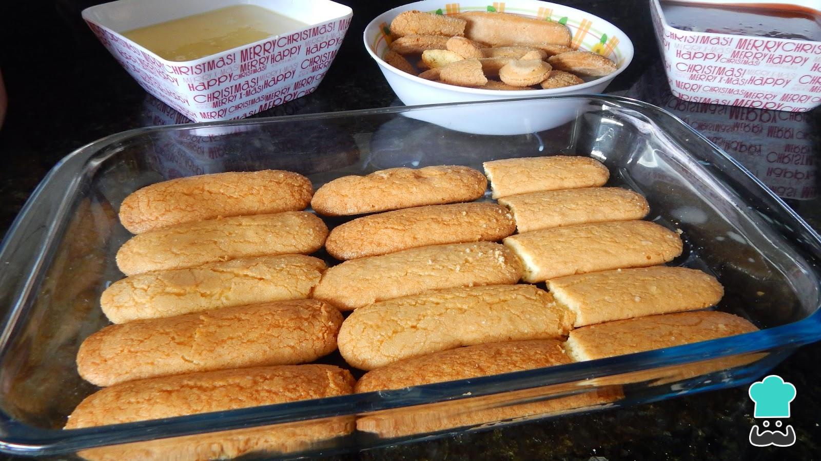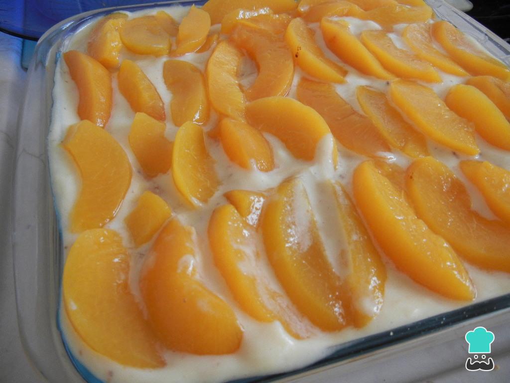 Continue preparando o pavê de pêssego simples: corte os pêssegos em pedaços e reserve. Umedeça os biscoitos na calda dos pêssegos e coloque alguns no fundo de um refratário de vidro.