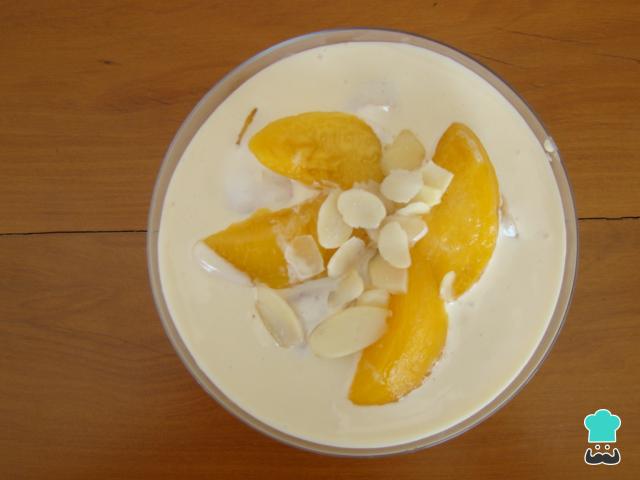 Disponha alguns pedaços de pêssego sobre os biscoitos e cubra com um pouco do creme branco. Repita até esgotar os ingredientes e decore com pêssegos.