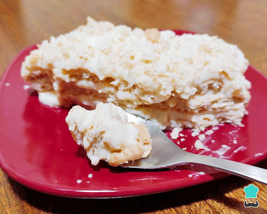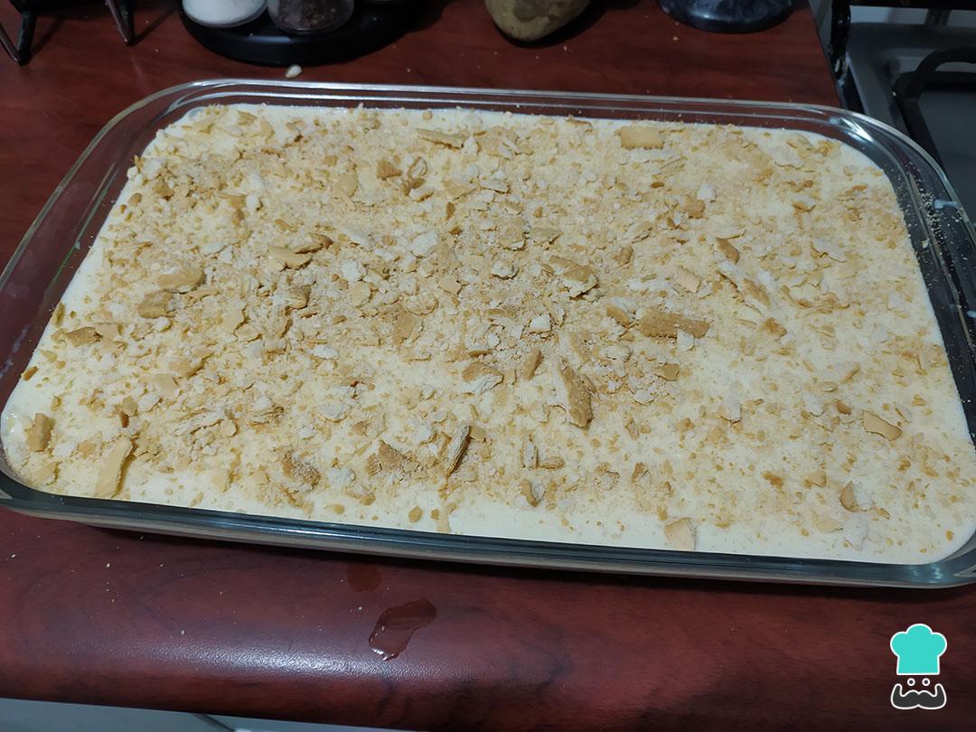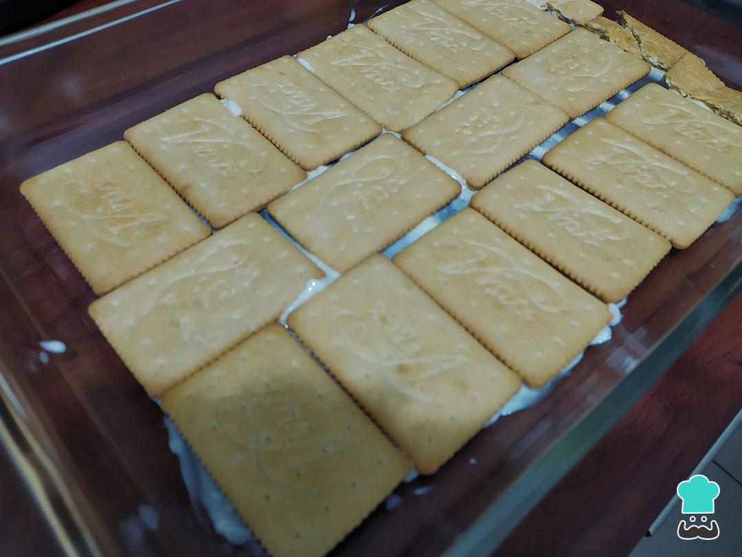 A última camada do pavê Napoleão deverá ser de creme. Se sobrarem biscoitos, quebre-os e use-os para decorar esta torta doce, como na foto. Reserve na geladeira por, pelo menos, 5 horas antes de servir.