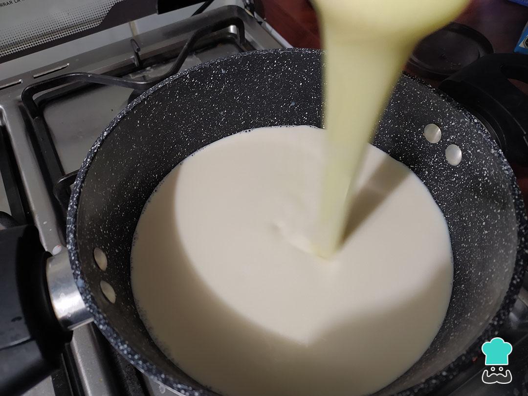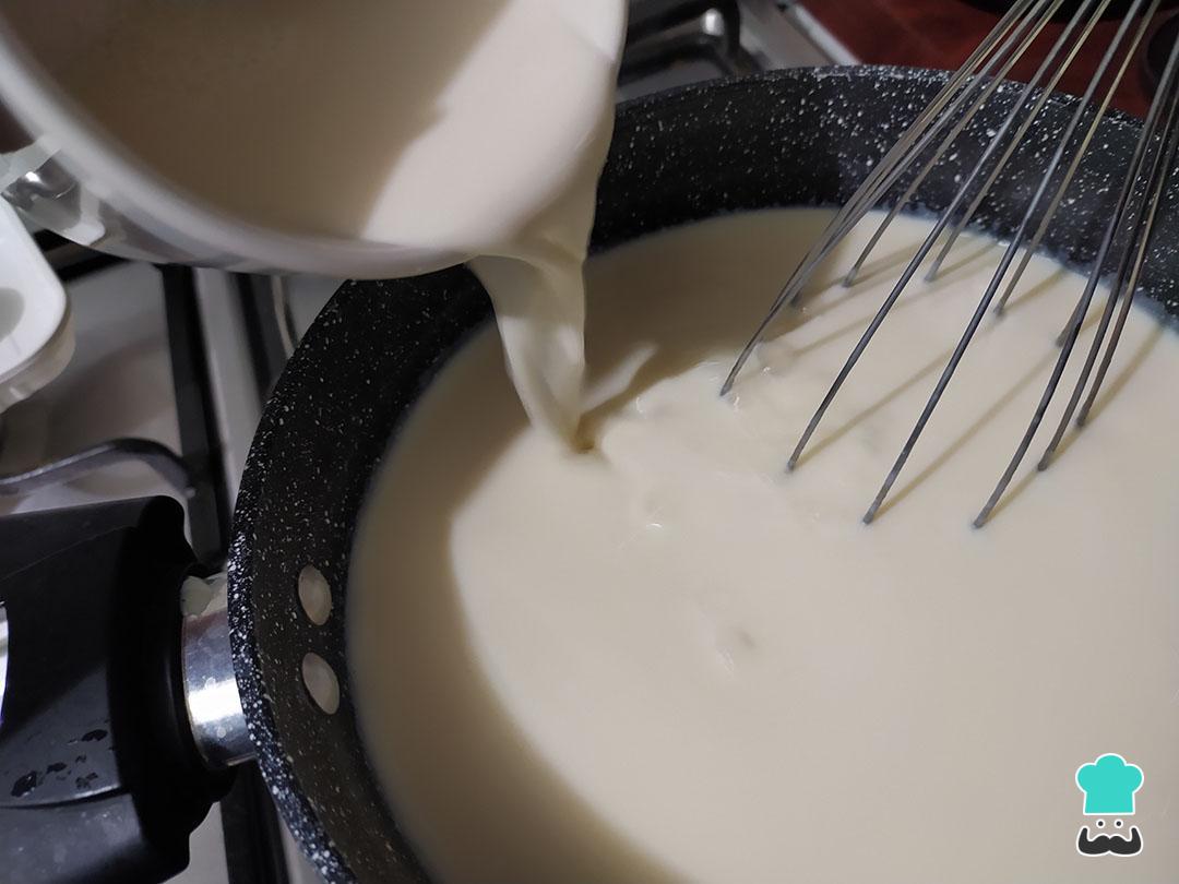 Separe meia xícara de leite e despeje o restante numa panela no fogo médio, junto com o leite condensado e o creme de leite. Misture, de preferência com fouet (batedor de claras).