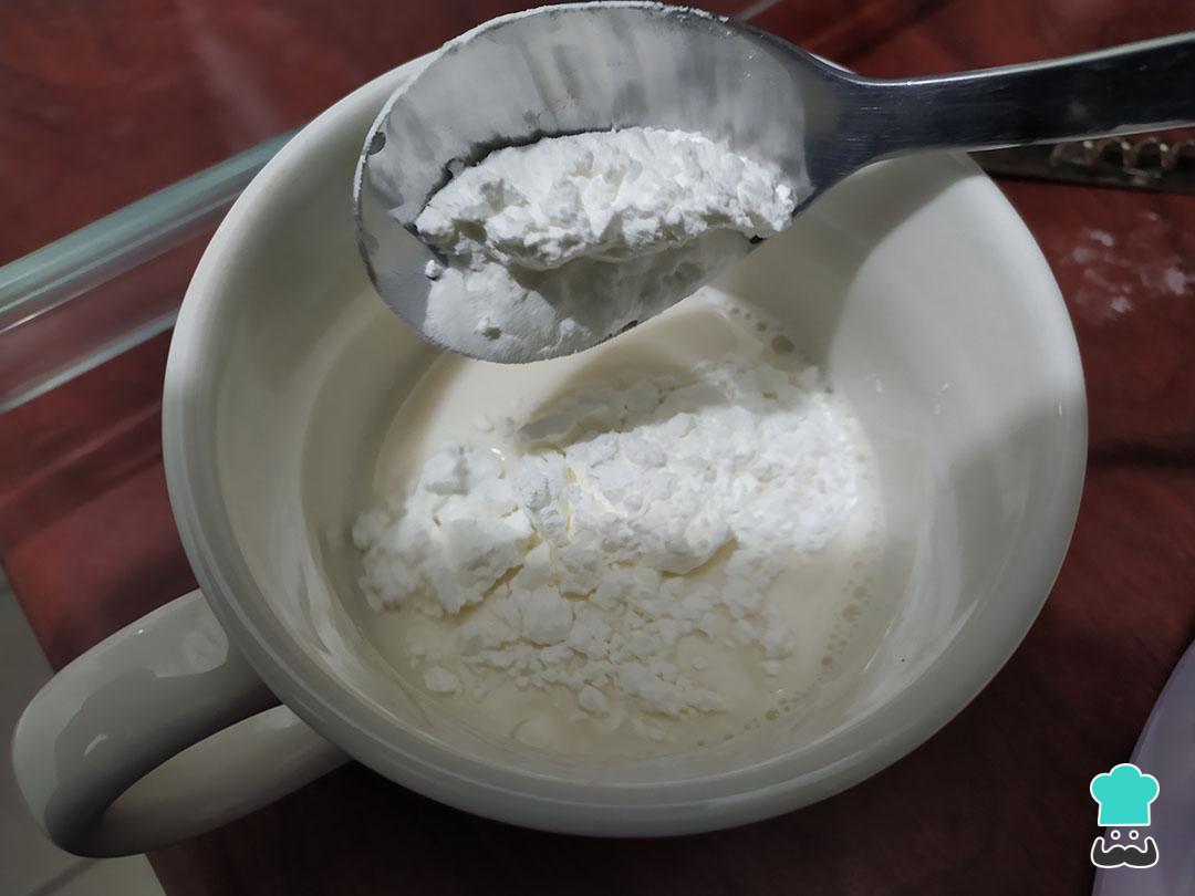 Adicione a maisena no leite reservado e misture até dissolver completamente. Isso é importante para que não se formem grumos nesta receita de creme napoleão.