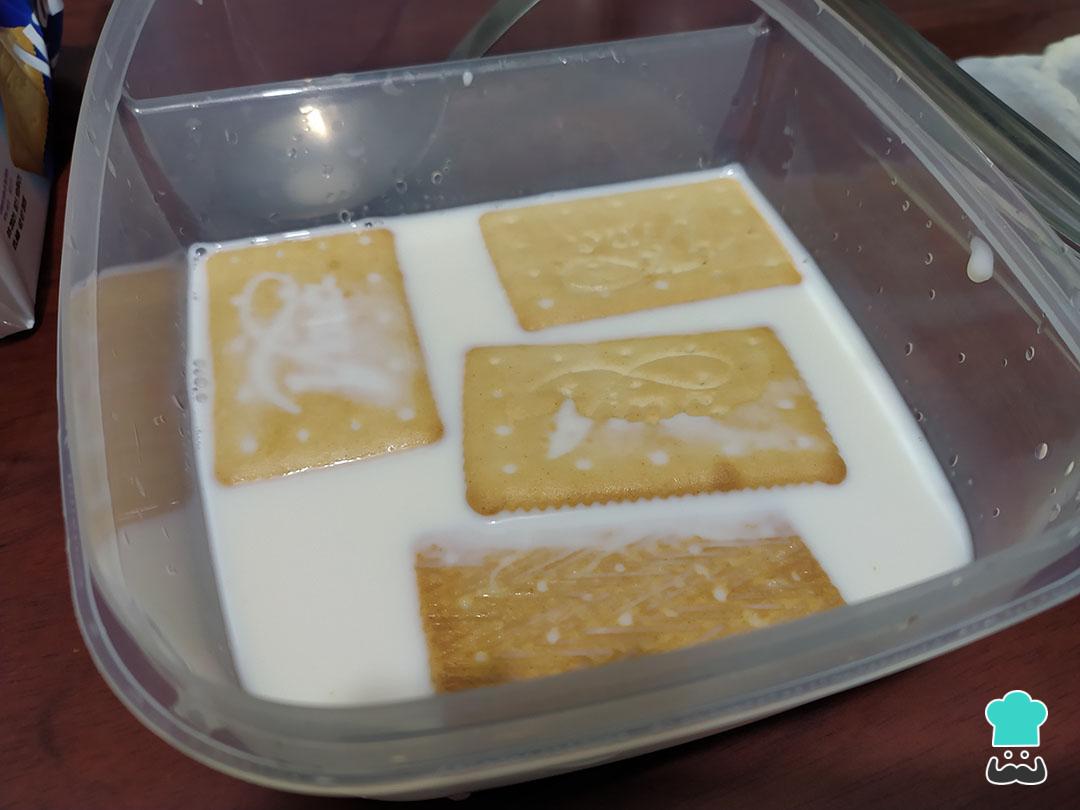 Para deixar os biscoitos macios, passe-os por leite no momento de montar esta sobremesa fácil.