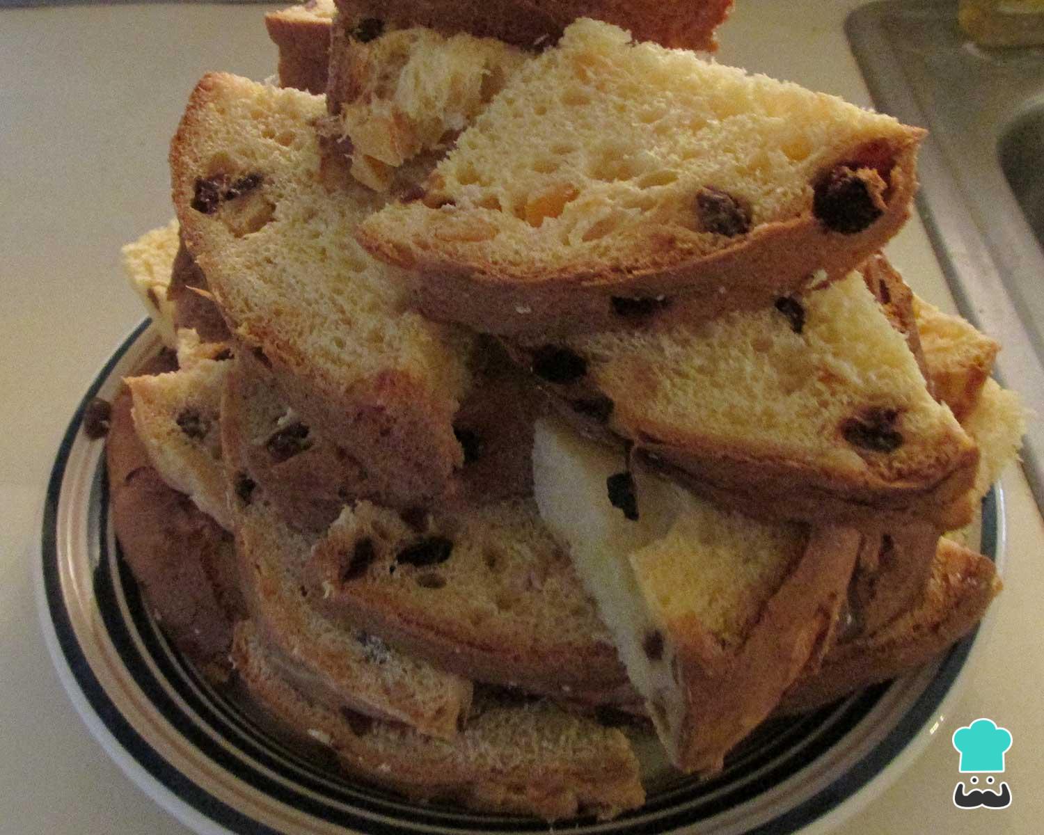 Para fazer esta receita de pavê de maracujá e panetone comece por cortar o Panetone em fatias iguais, com cerca de 1 dedo de espessura. Reserve.