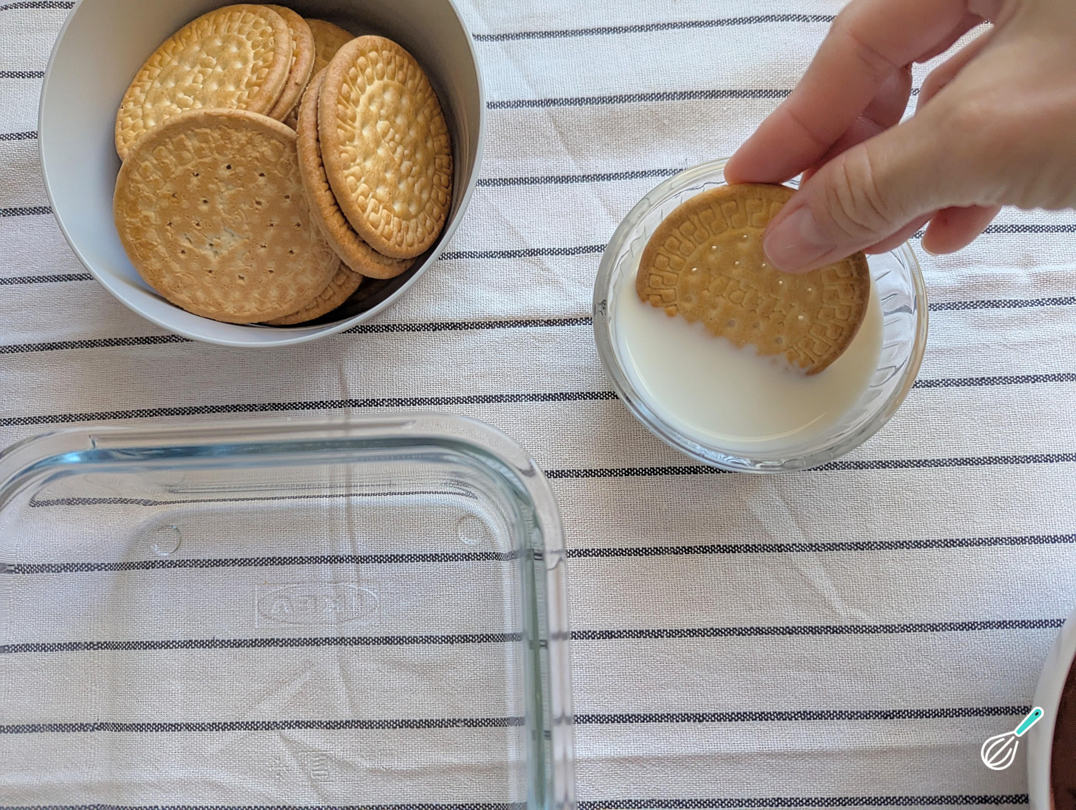 Vamos agora começar a montagem do pavê. Se preferir os biscoitos mais macios, passe-os rapidamente em leite antes de montar.