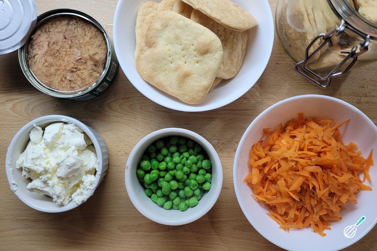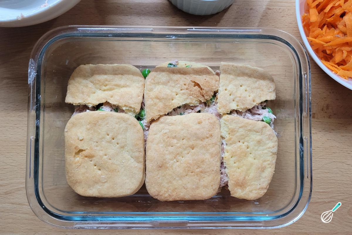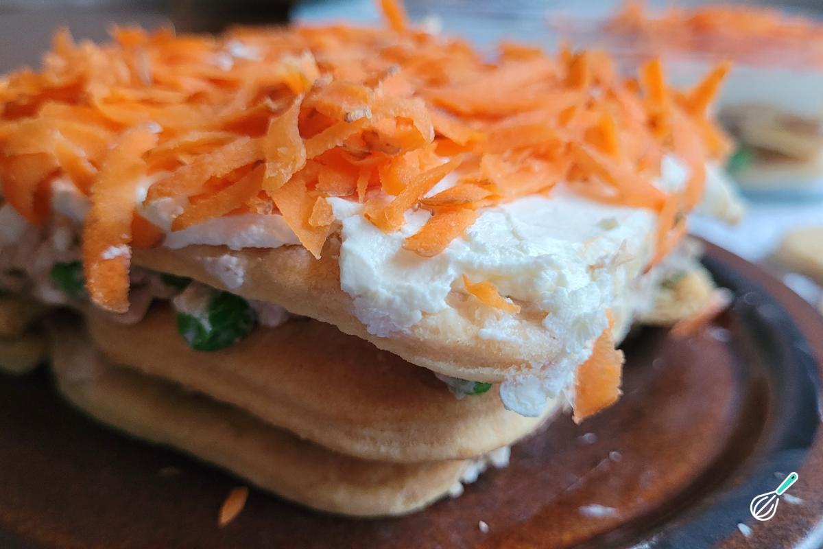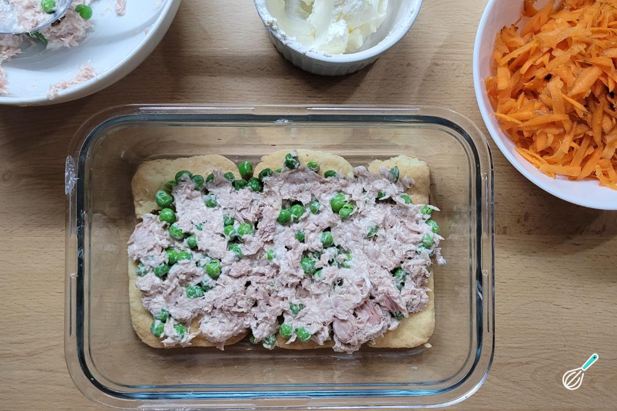 A base são biscoitos tipo cream cracker ou água e sal. O recheio é super versátil e é uma ótima opção para usar o que tem na geladeira. Você pode, inclusive, fazer mais de um recheio alternando entre as camadas de biscoito. Aqui fizemos uma versão ainda mais prática com atum em lata, ervilha congelada e cenoura ralada no topo.