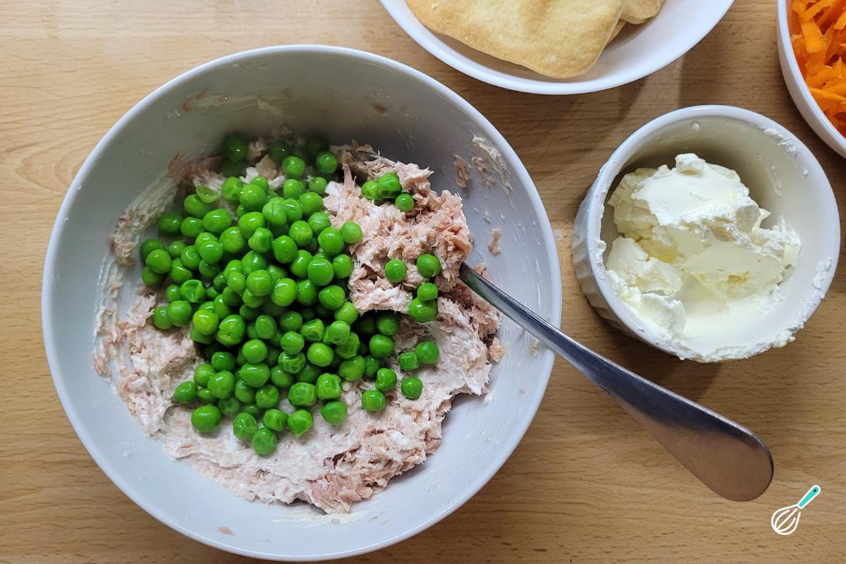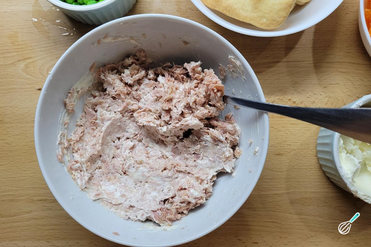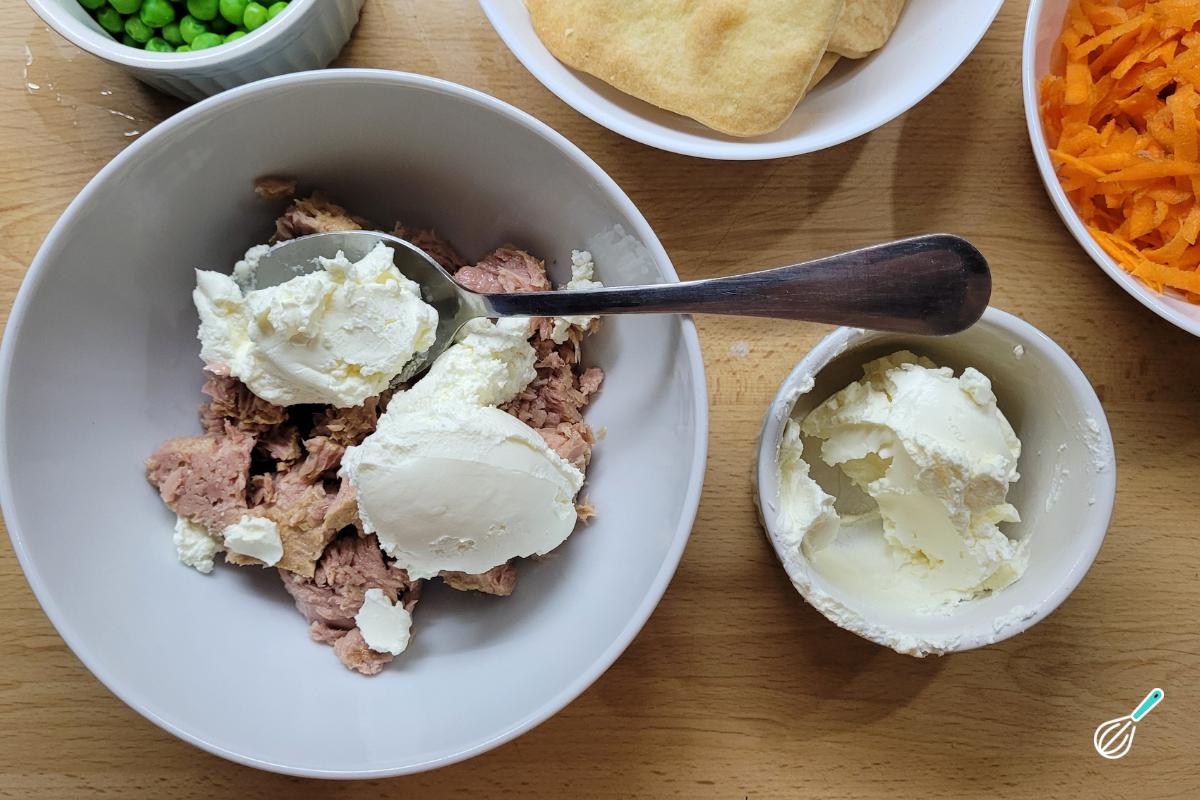 Escorra o atum e adicione metade do cream cheese.