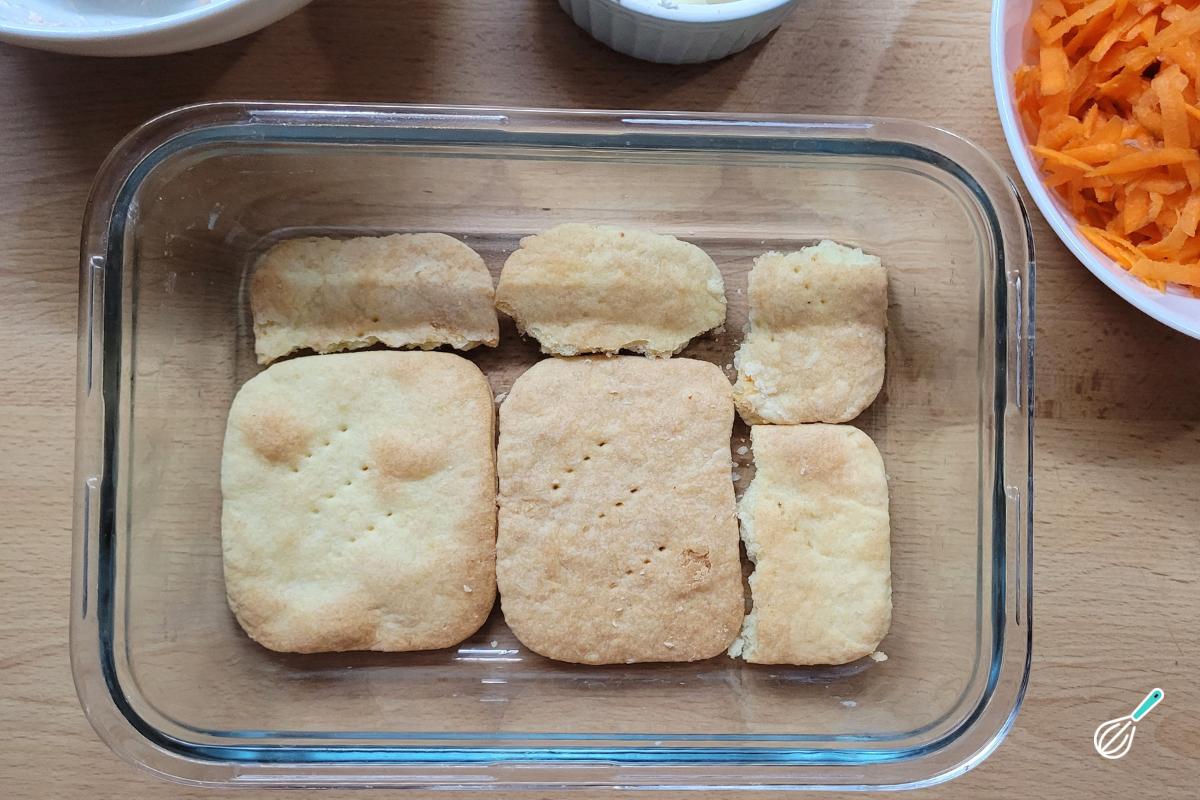 Em uma travessa de servir, disponha os biscoitos formando uma camada sobre todo o fundo. Caso seja necessário, corte os biscoitos para acomodá-los.