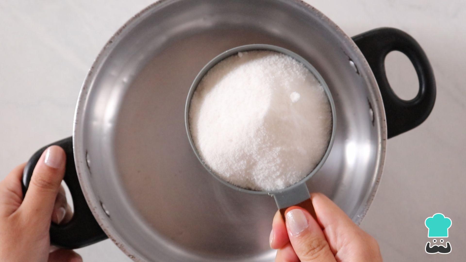 Vamos preparar o caramelo: coloque em uma panela o açúcar e leve para derreter em fogo baixo até ficar na cor âmbar.