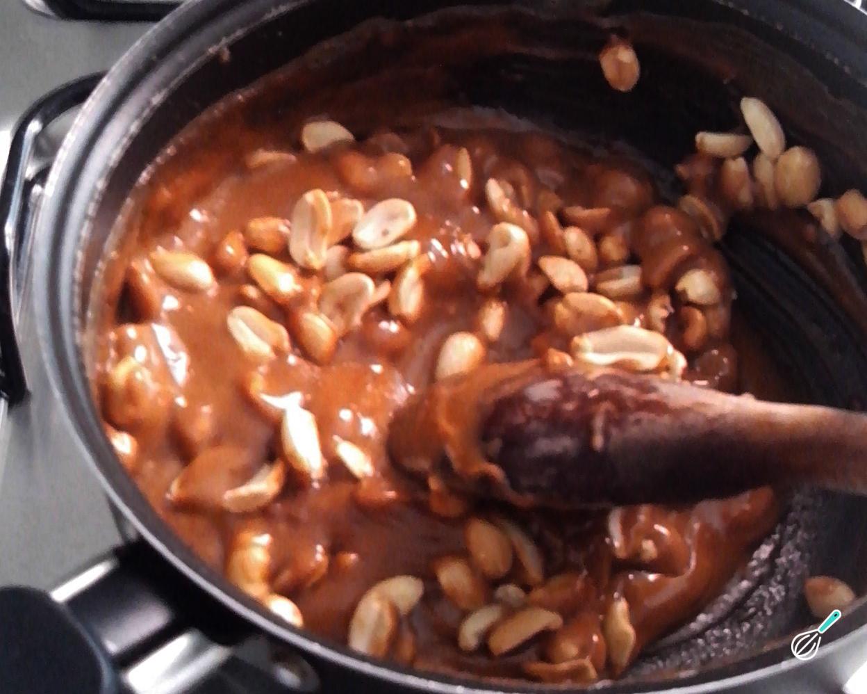 Em seguida desligue o fogo e adicione o amendoim e o sal. Misture bem.