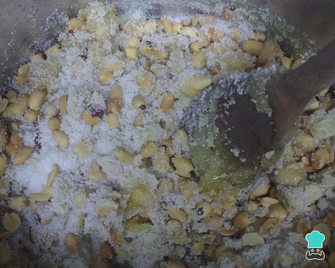Continue preparando esta receita de receita de pé de moleque tradicional: numa panela coloque o amendoim, o açúcar e a glucose de milho e misture.