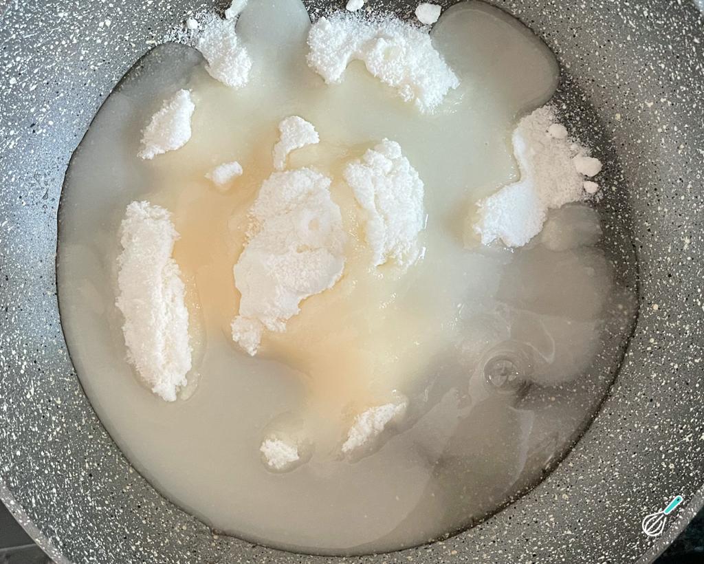 Numa frigideira no fogo desligado, misture a água e o açúcar. Ligue o fogo no baixo.