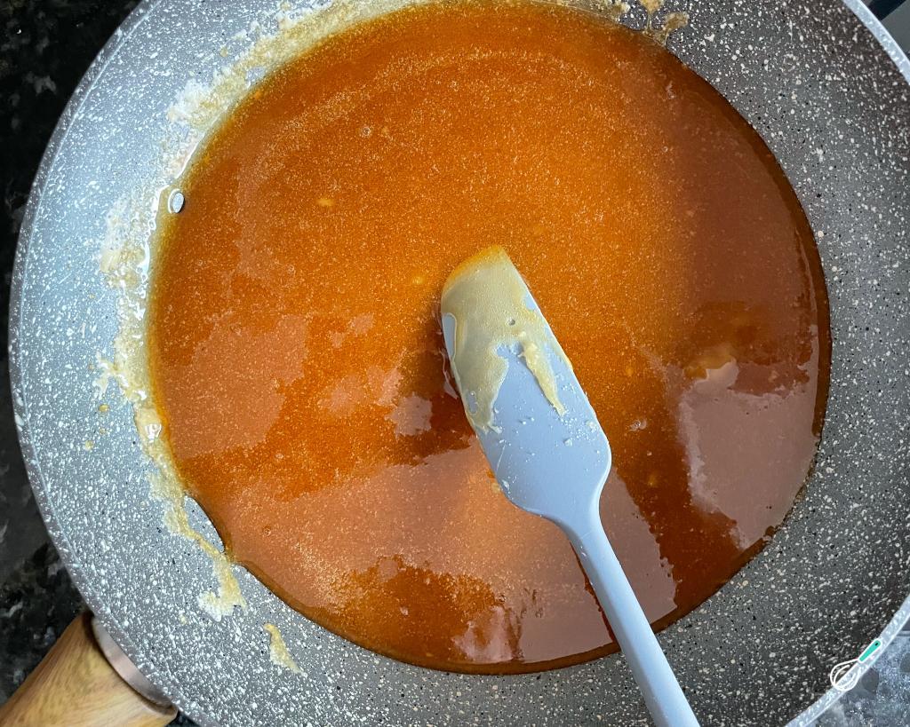 Quando o açúcar começar a caramelizar, mexa para não queimar. Assim que todo o açúcar dissolver, desligue o fogo.