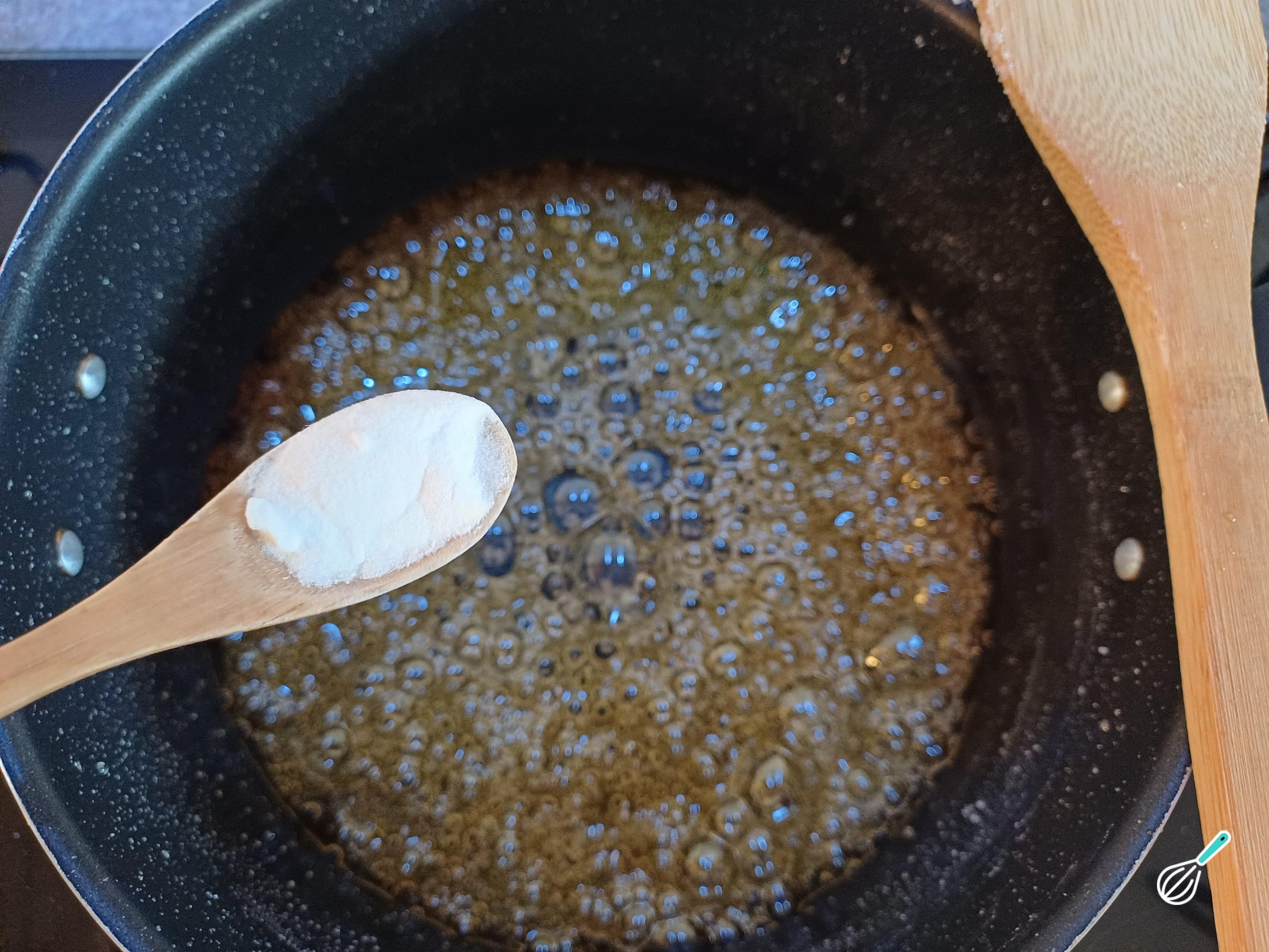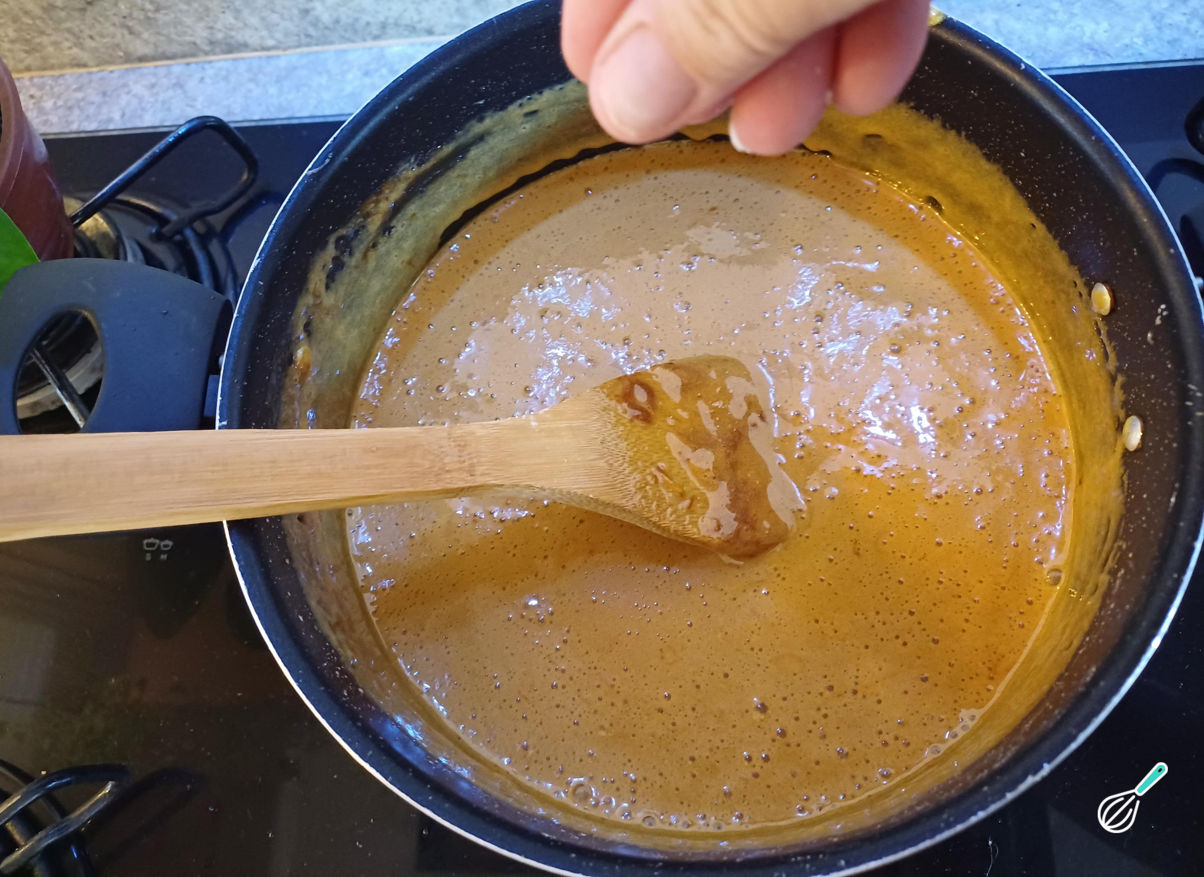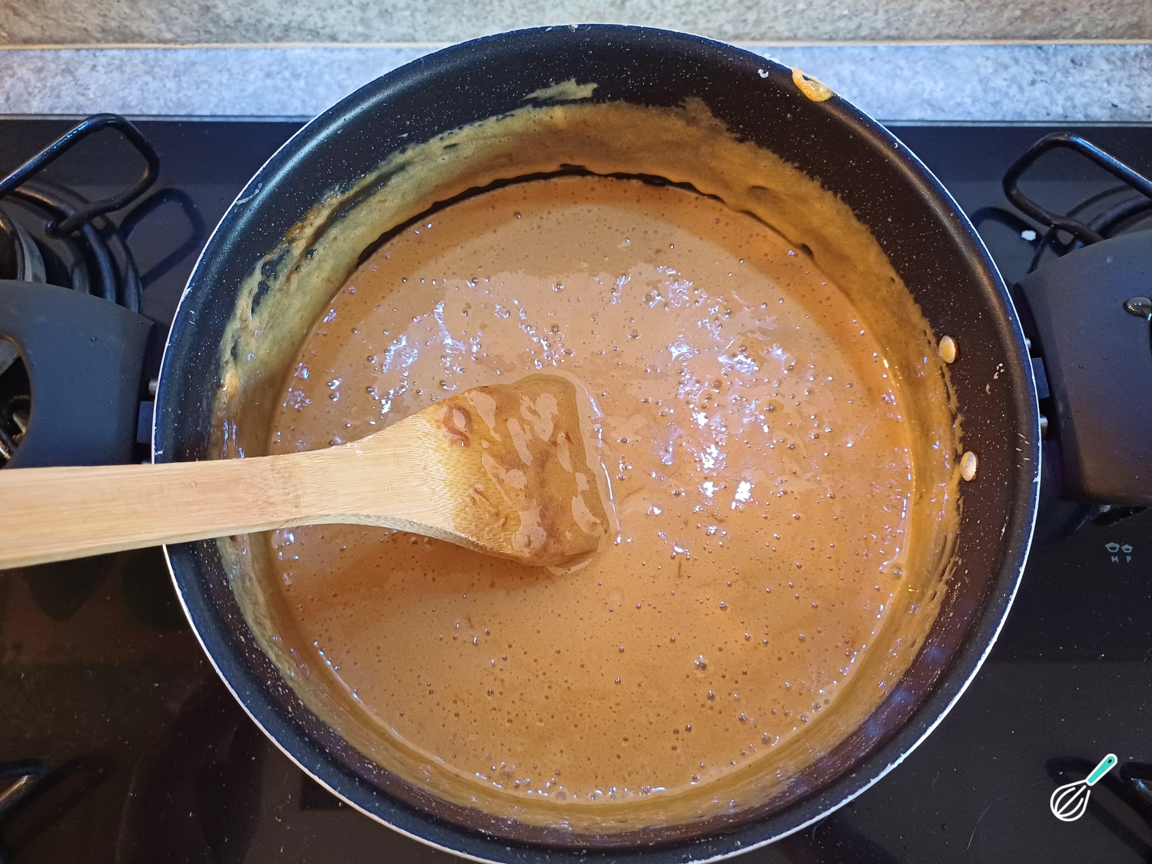 Dica: Cuidado nesse momento, porque o caramelo vai crescer e subir um vapor quente. Mexa com cuidado para não esparramar fora da panela.