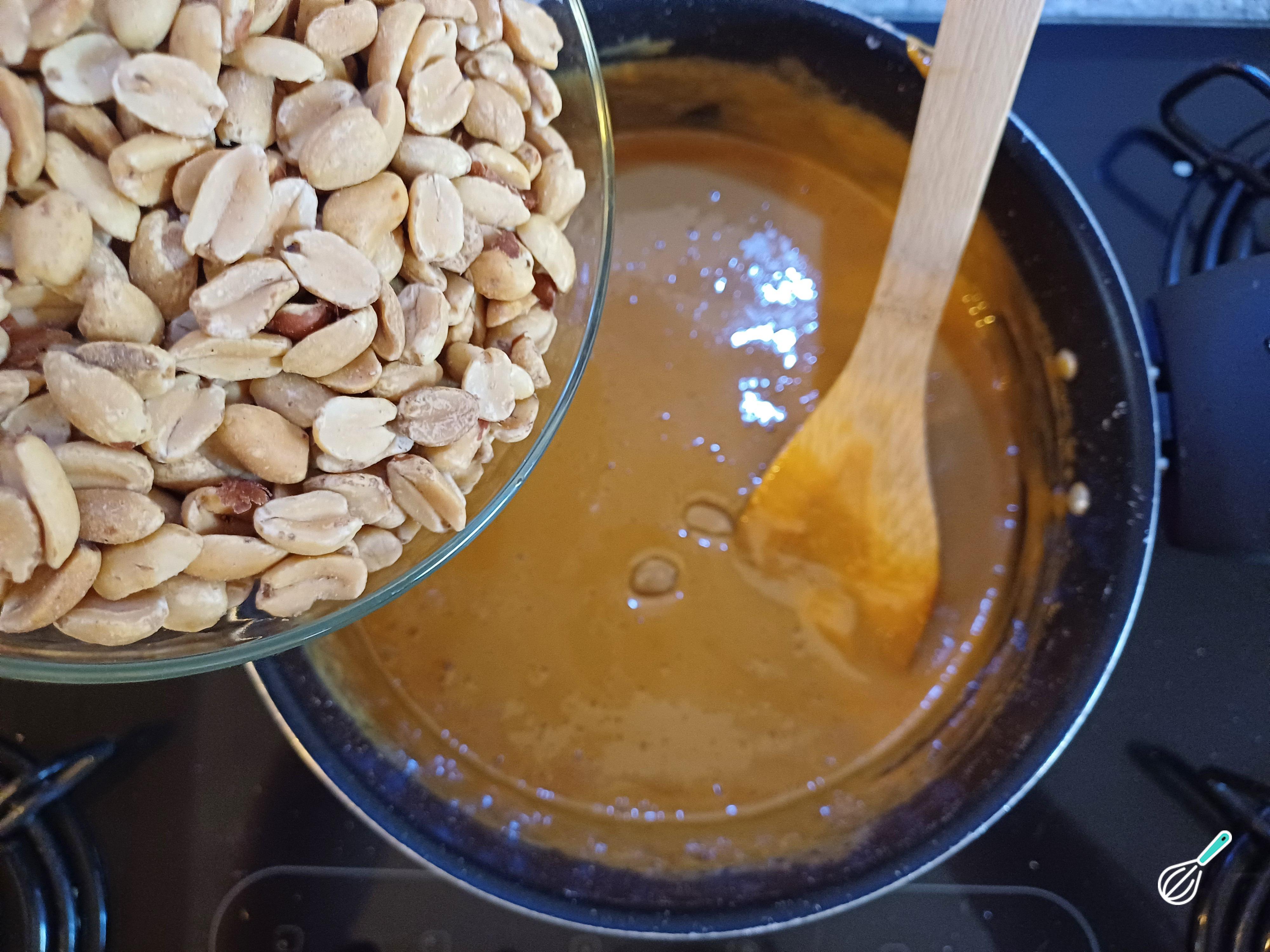 Junte o amendoim torrado e mexa até começar a desprender do fundo da panela, igual ponto de brigadeiro.