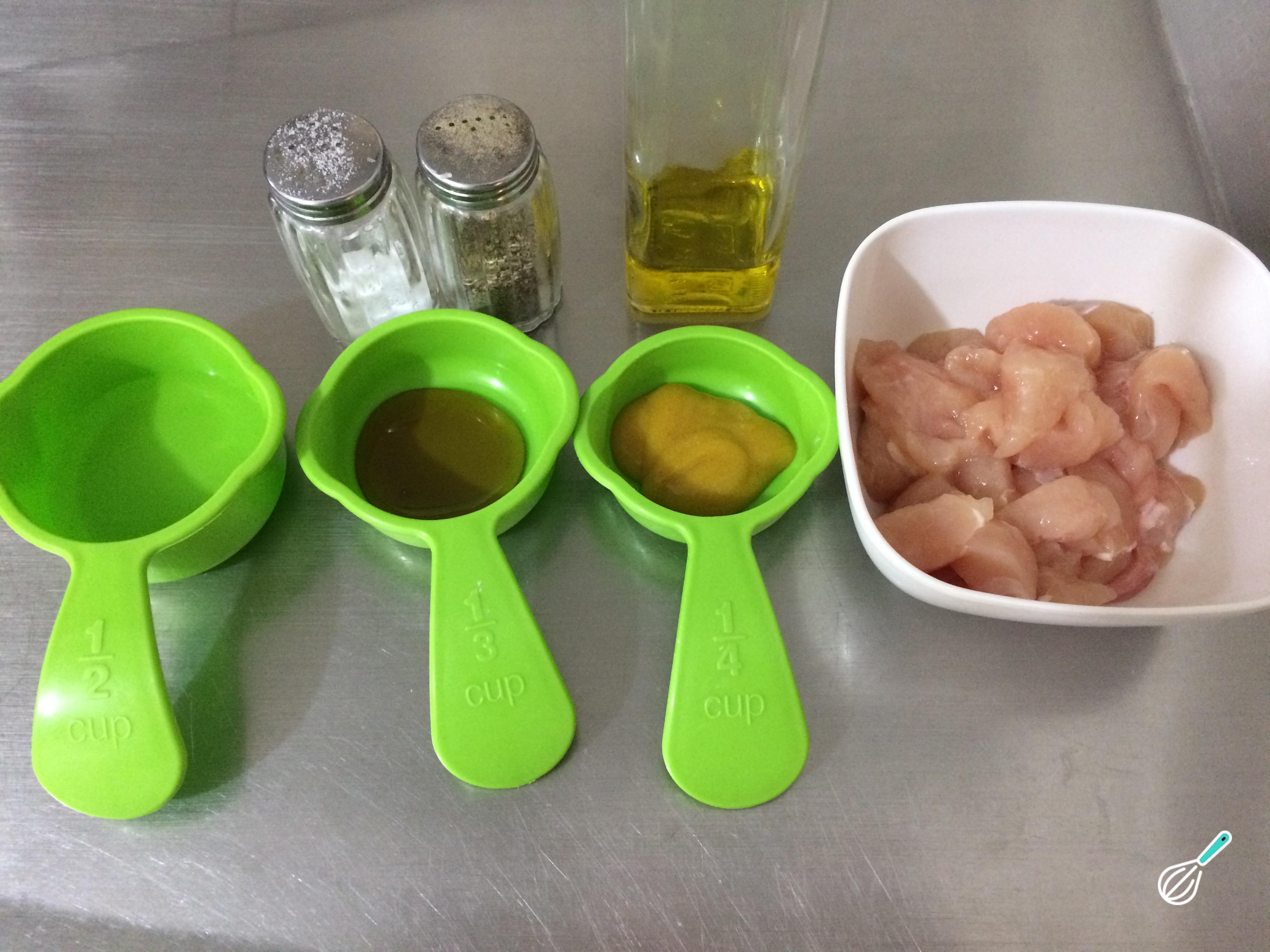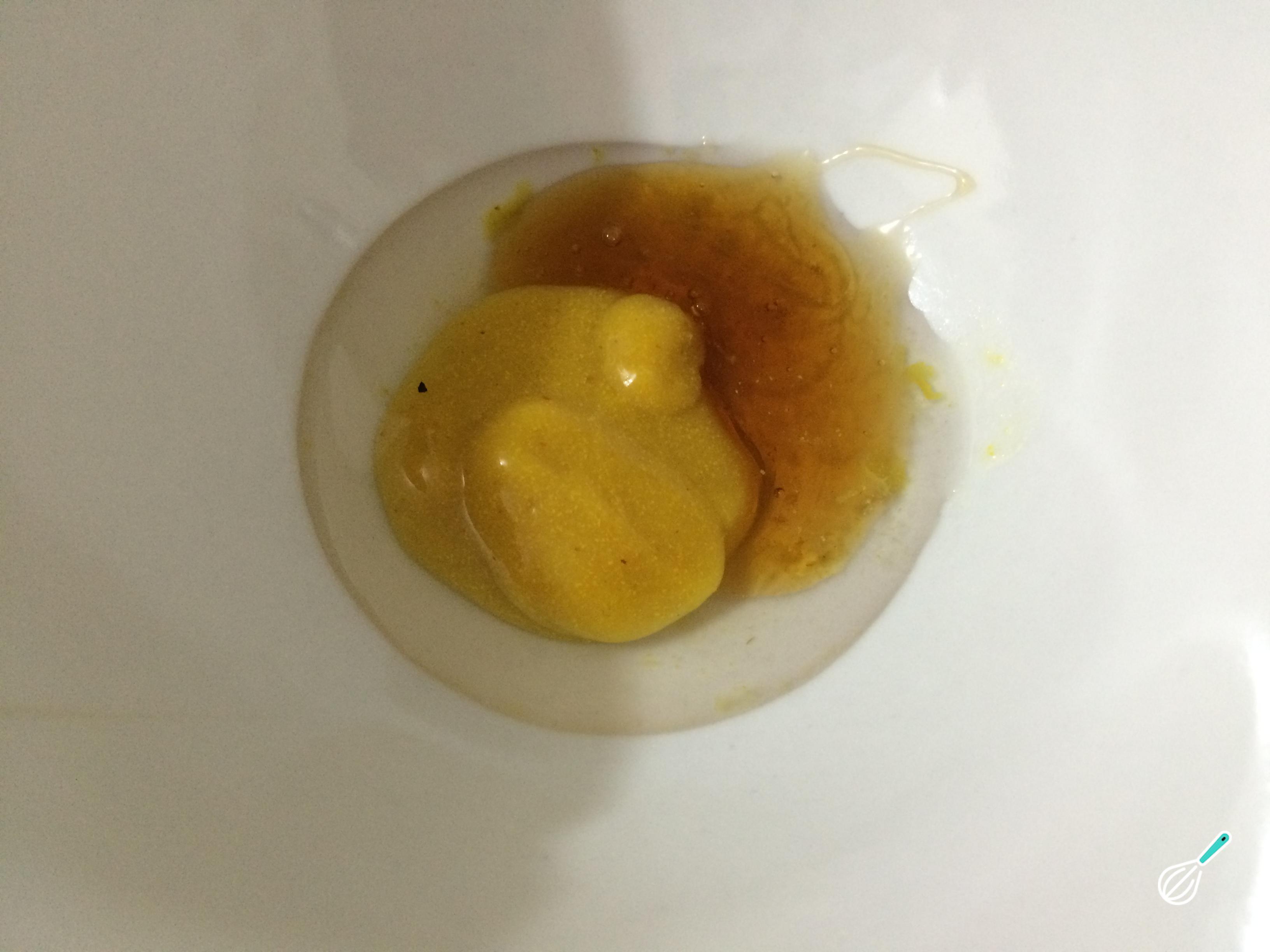 Prepare o molho de mostarda e mel simples misturando bem a mostarda, o mel e o vinagre.