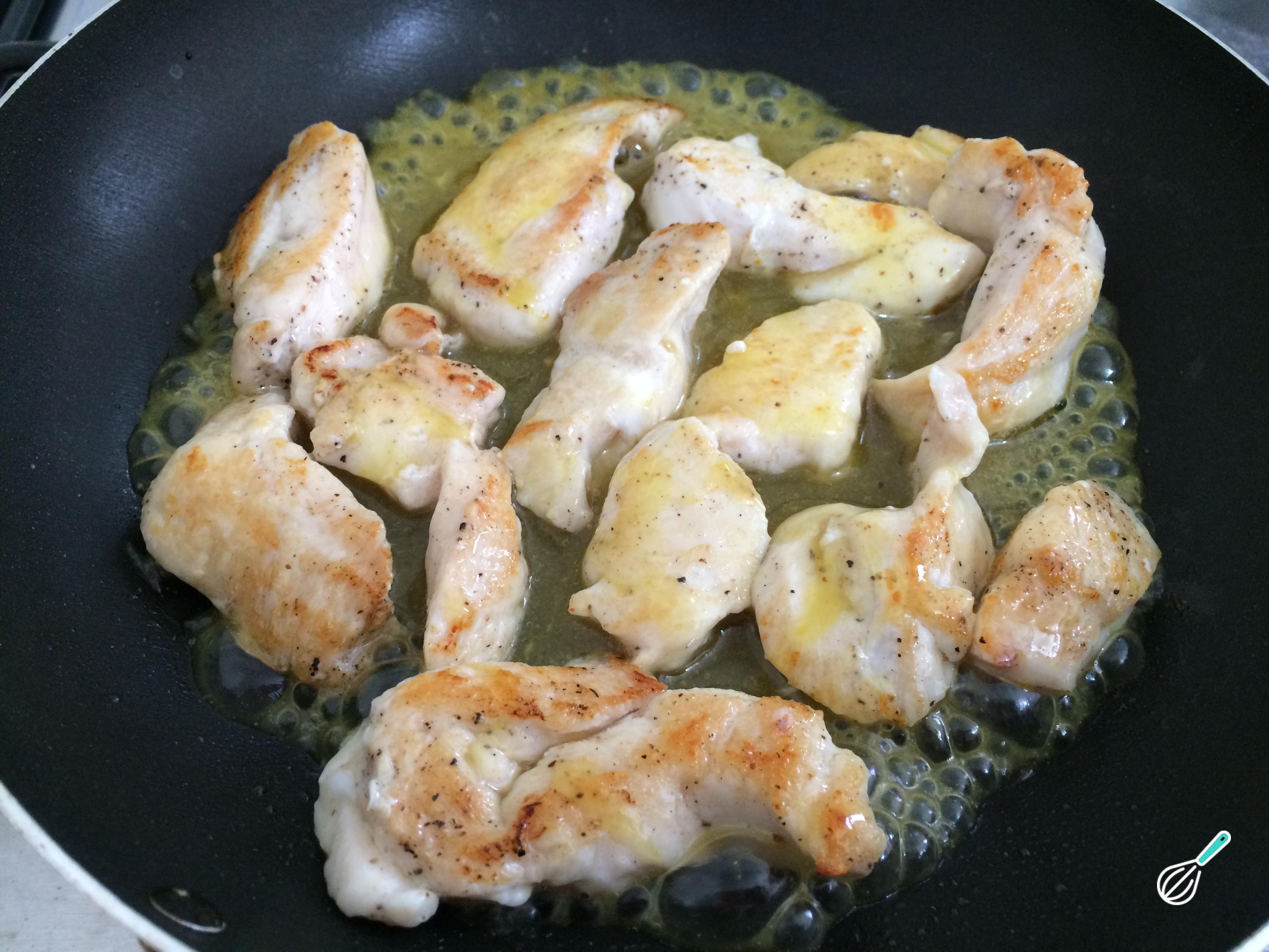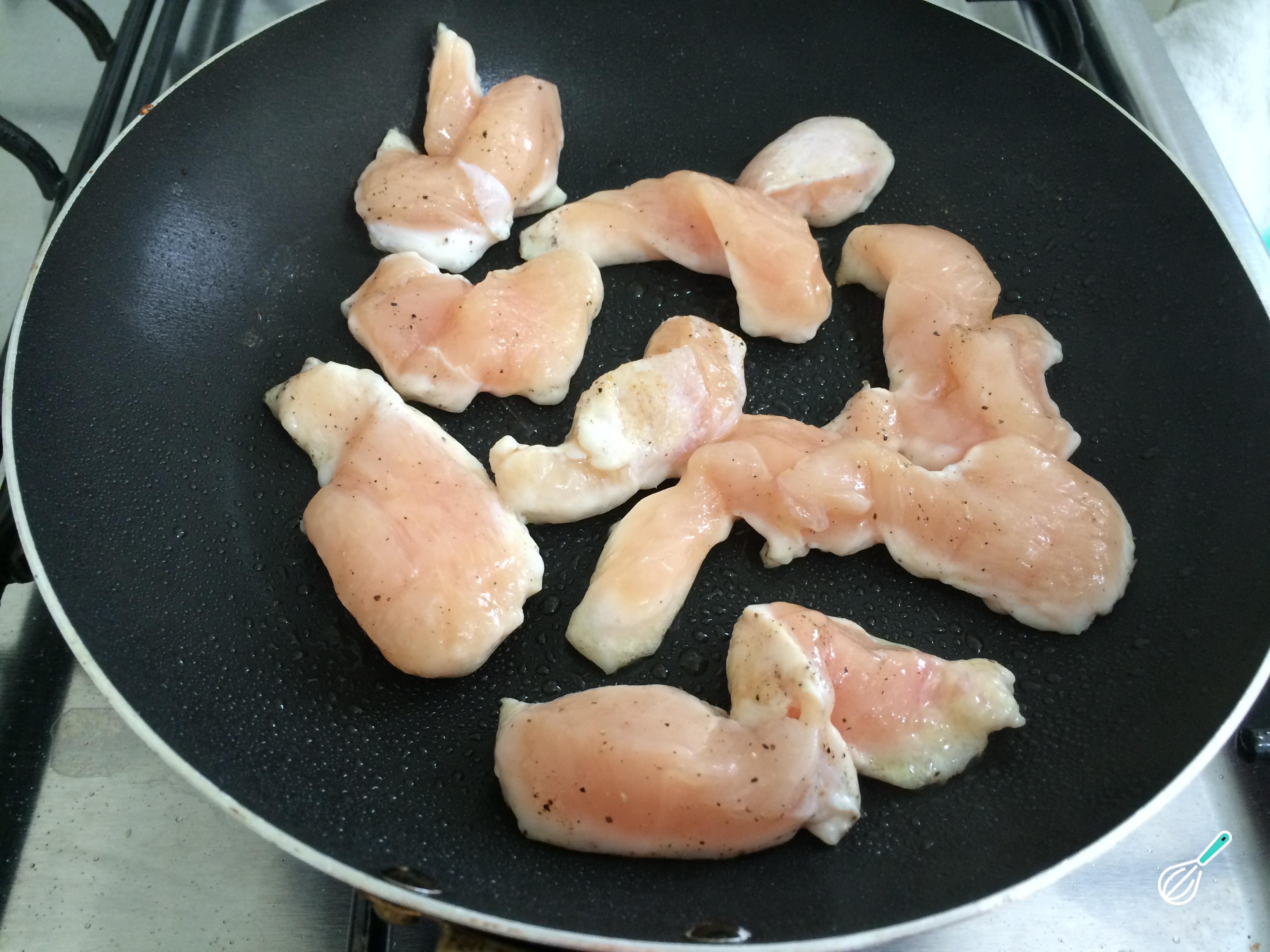 Antes de fazer esta receita, o primeiro passo é preparar todos os ingredientes. Corte o peito de frango em tiras, para que cozinhe mais rapidamente.