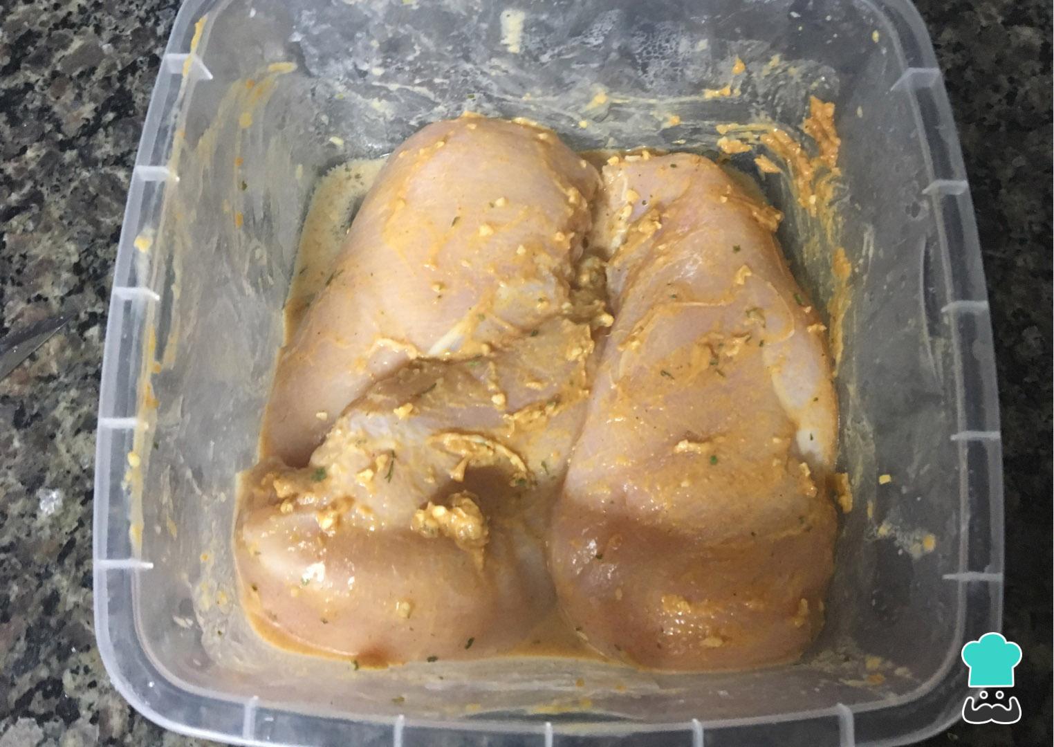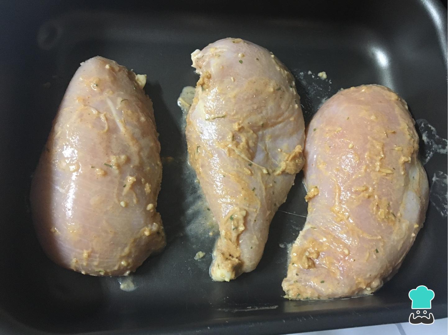 Em uma forma coloque o frango e leve para assar a 180ºC até dourar o que, dependendo do tamanho dos peitos, poderá demorar entre 30 a 40 minutos.