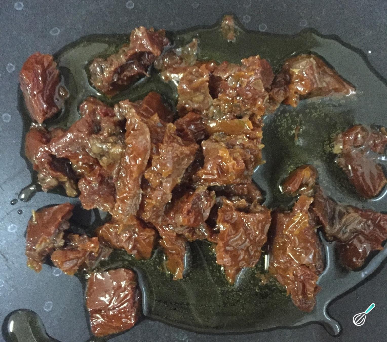Numa frigideira coloque 2 colheres de sopa de azeite e adicione o tomate seco cortado em quadrados.