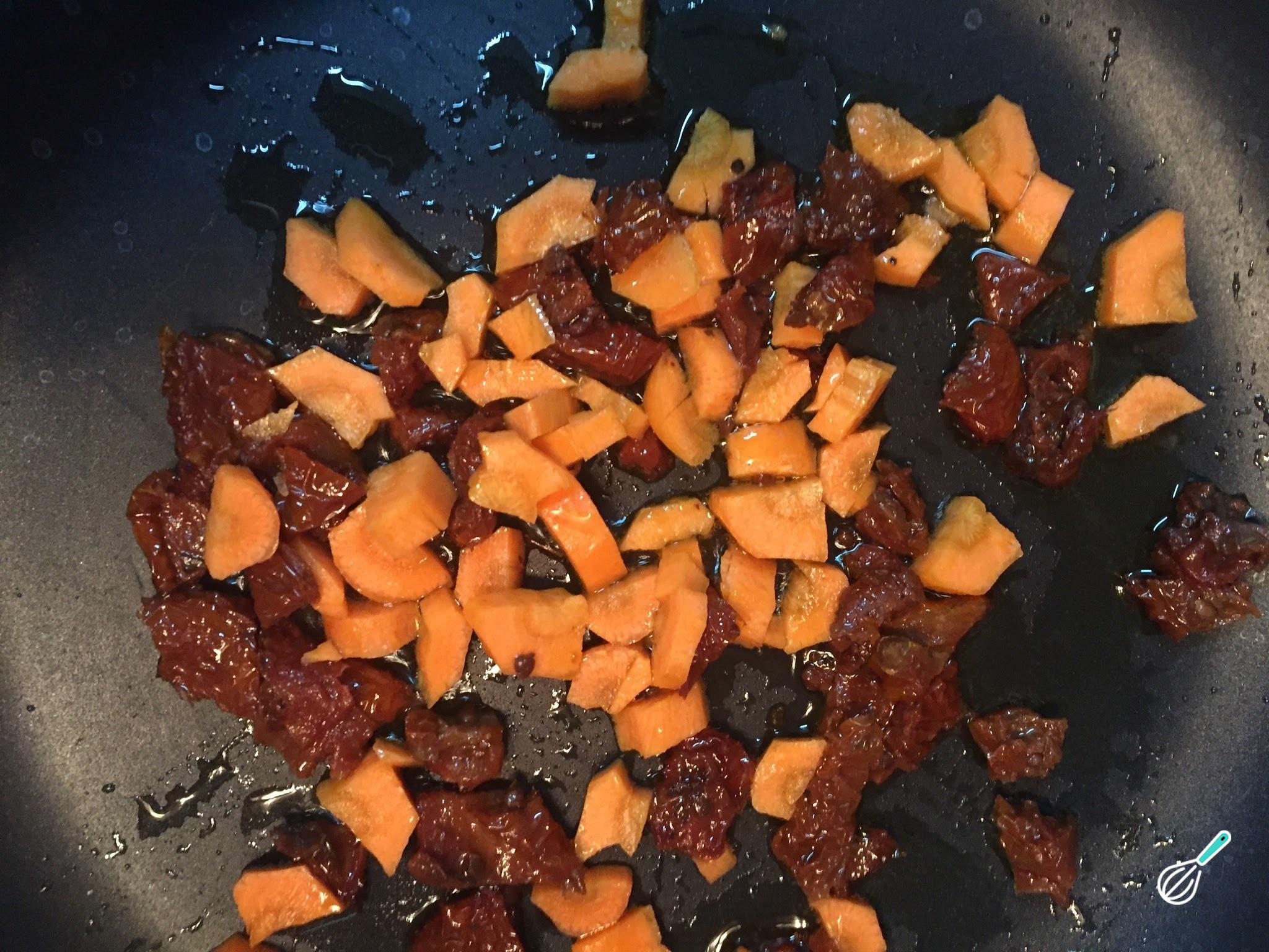 Enquanto o tomate seco refoga, descasque a cenoura, corte em pedaços pequenos e depois de pronta adicione a mesma ao refogado.
