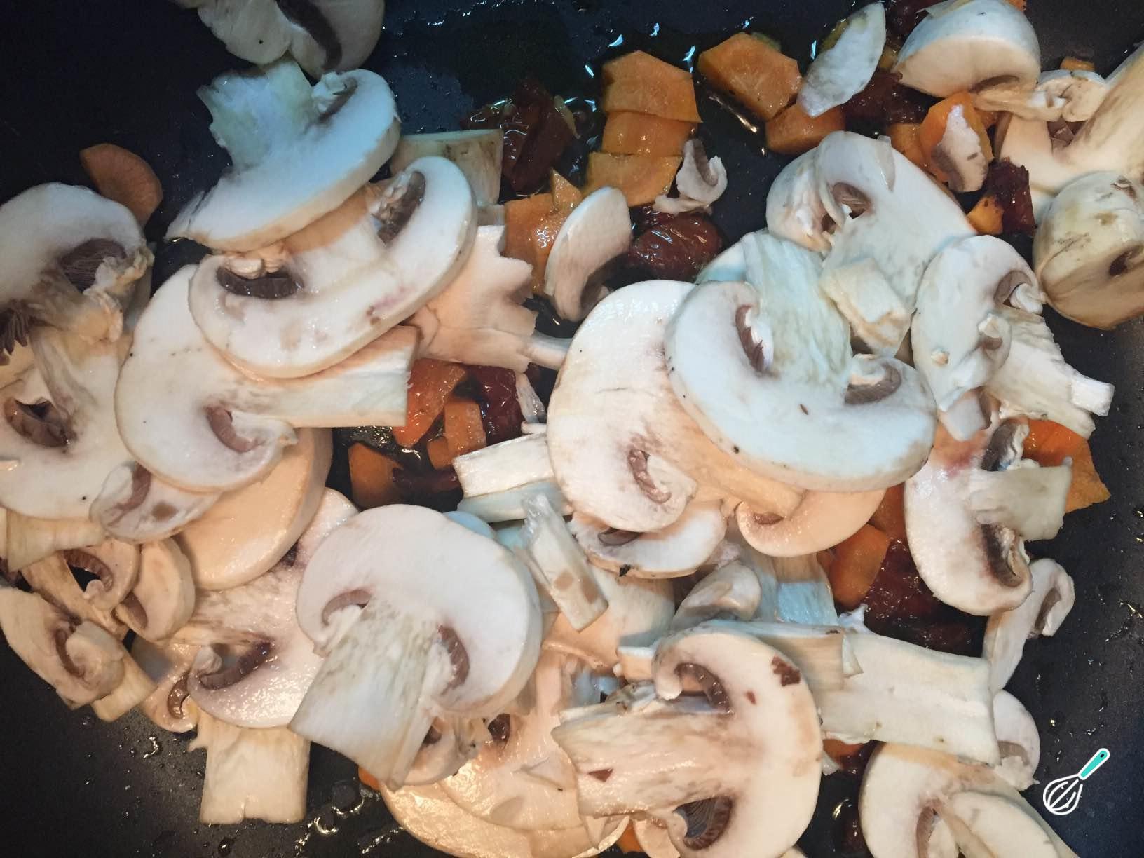 Deixe refogar o tomate seco e a cenoura por 2 minutos e enquanto deixa refogar, lave os cogumelos. Passado esse tempo, adicione os cogumelos lavados.