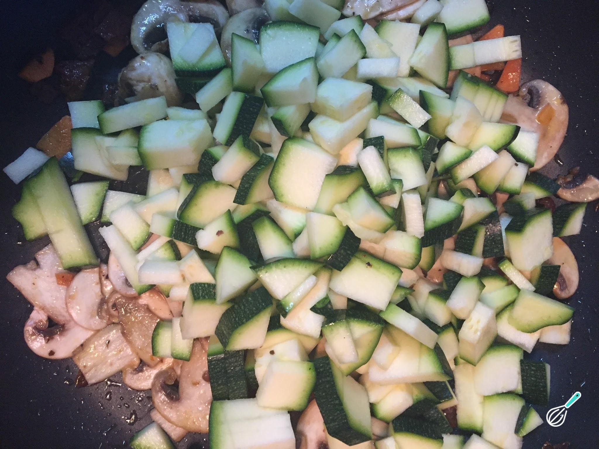 Depois dos cogumelos adicionados, deixe refogar por 5 minutos. Comece a preparar a abobrinha, cortando-a em cubos pequenos. Quando os cogumelos começarem a ganhar cor adicione a abobrinha e deixe refogar por mais uns minutos.