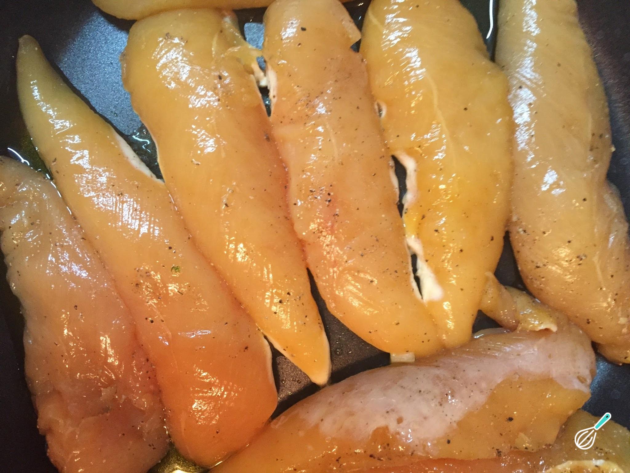 Tempere os peitos de frango cortados em tiras com sal, pimenta do reino e reserve.