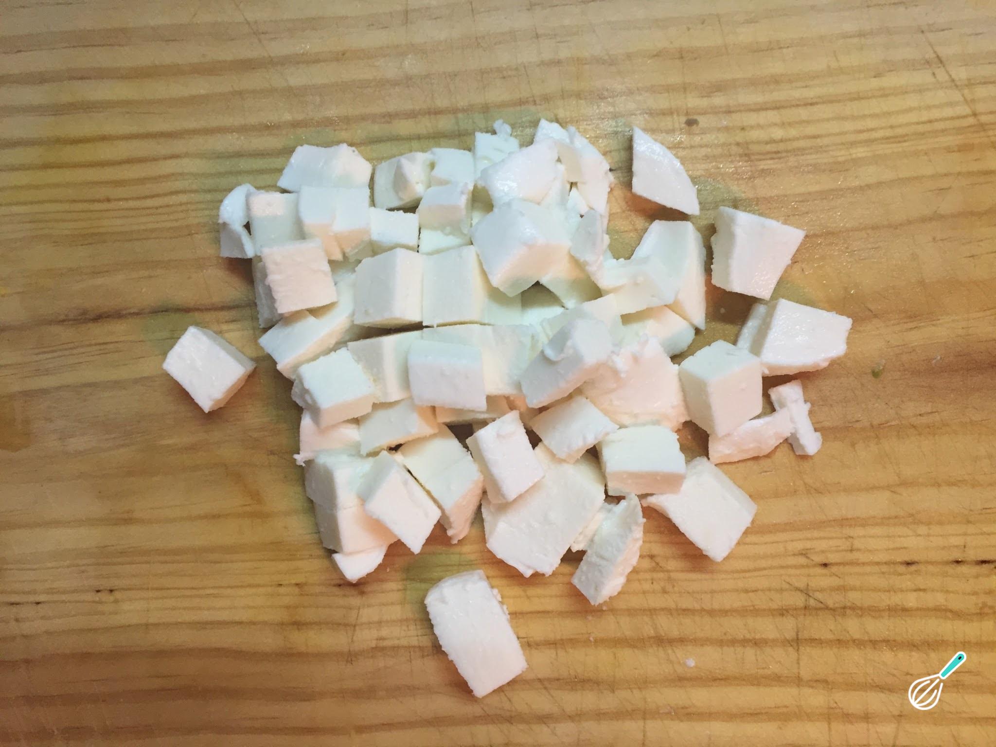 Enquanto o peito de frango cozinha, corte a mussarela em quadrados e reserve.