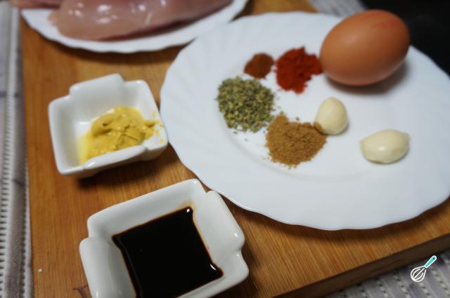 Para começar com o Peito de frango frito rápido e fácil, comece preparando os temperos: mostarda, molho de soja, orégano, cominho, páprica doce e, se quiser, também um pouco de páprica picante .