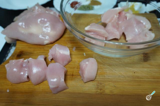 Limpe os peitos de frango e corte em pedaços mais ou menos iguais, para depois cozinhar por igual.