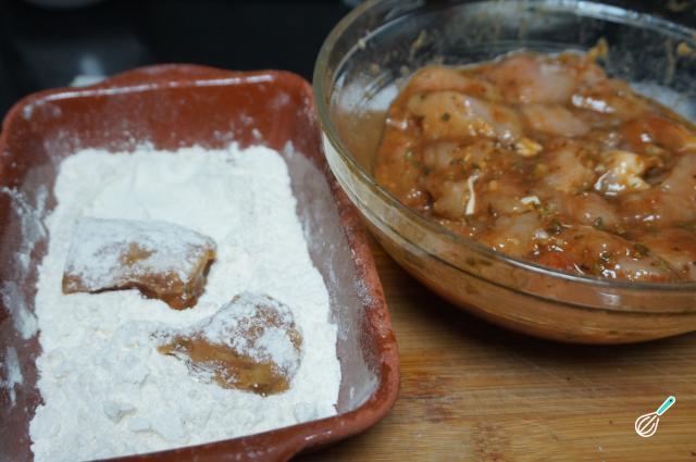 Adicione a farinha em uma tigela e retire o excesso do molho do frango. Depois, passe os pedaços pela farinha .