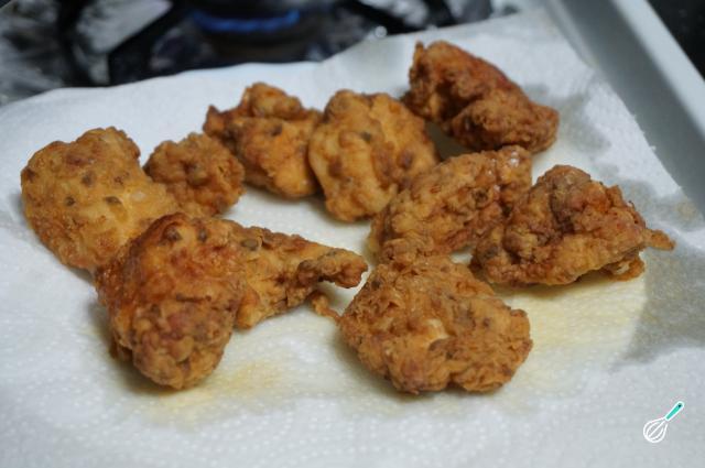 Coloque em um prato algumas folhas de papel de cozinha e adicione os pedaços de frango ao retirar do óleo, para que absorva o excesso de óleo que soltar.