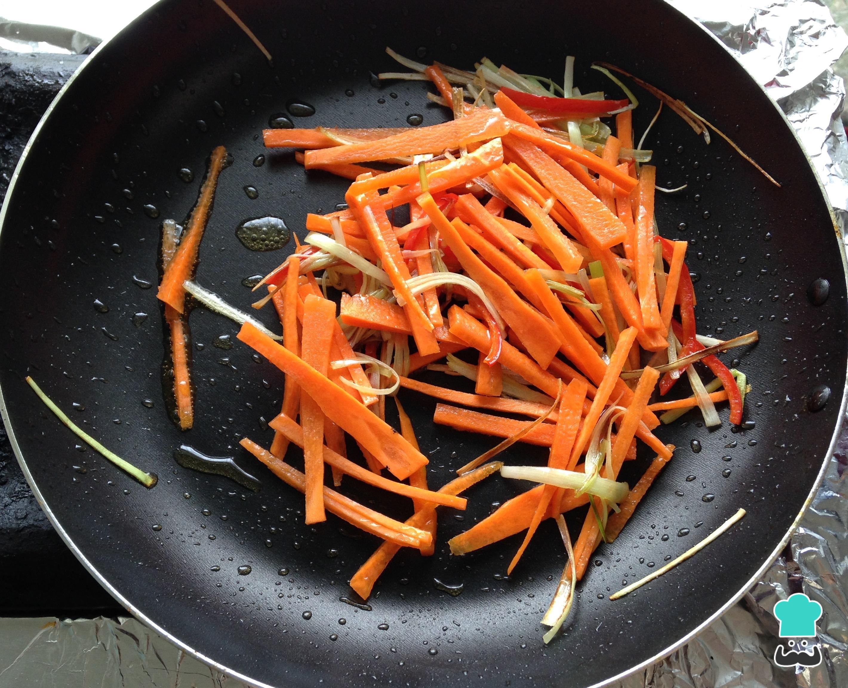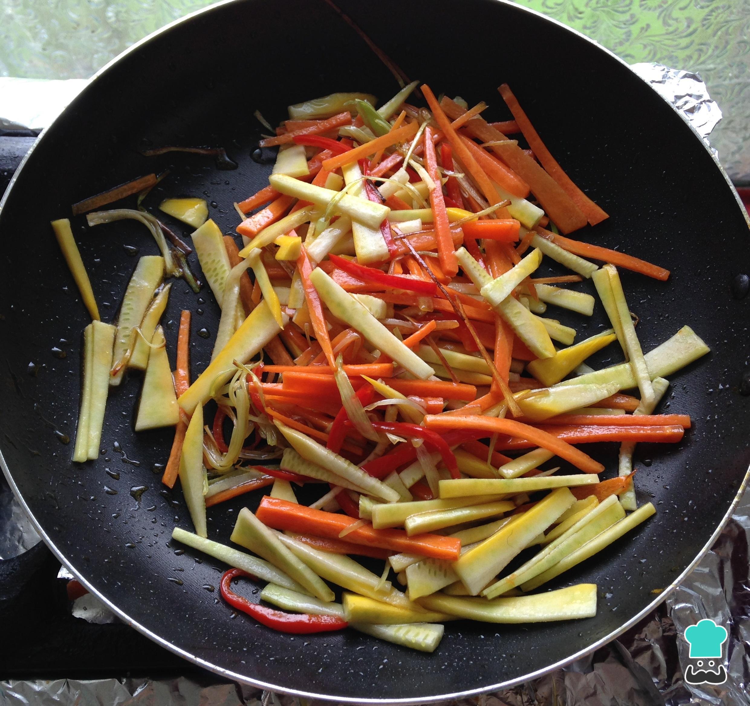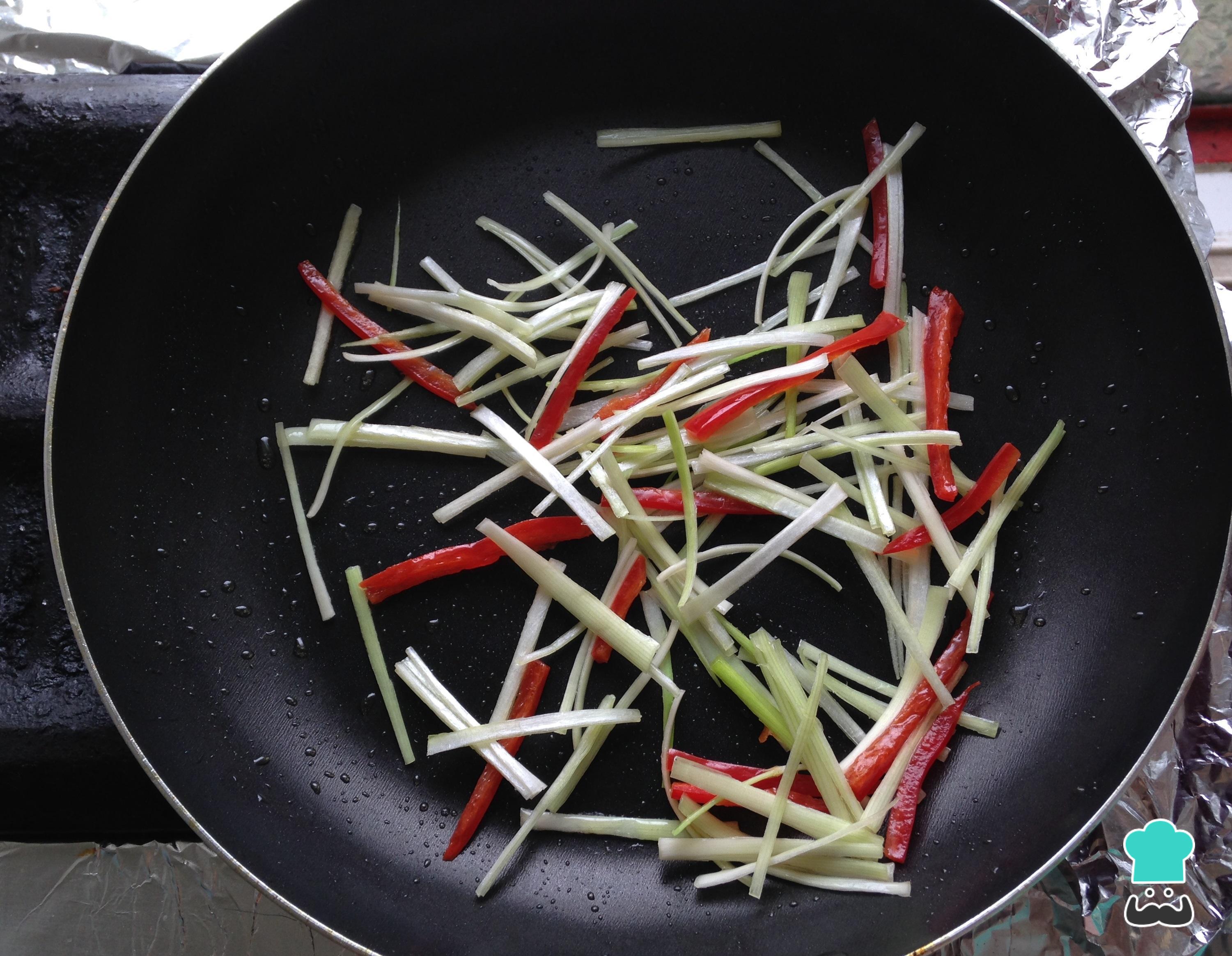 Prepare todos os ingredientes: corte os legumes em juliana.