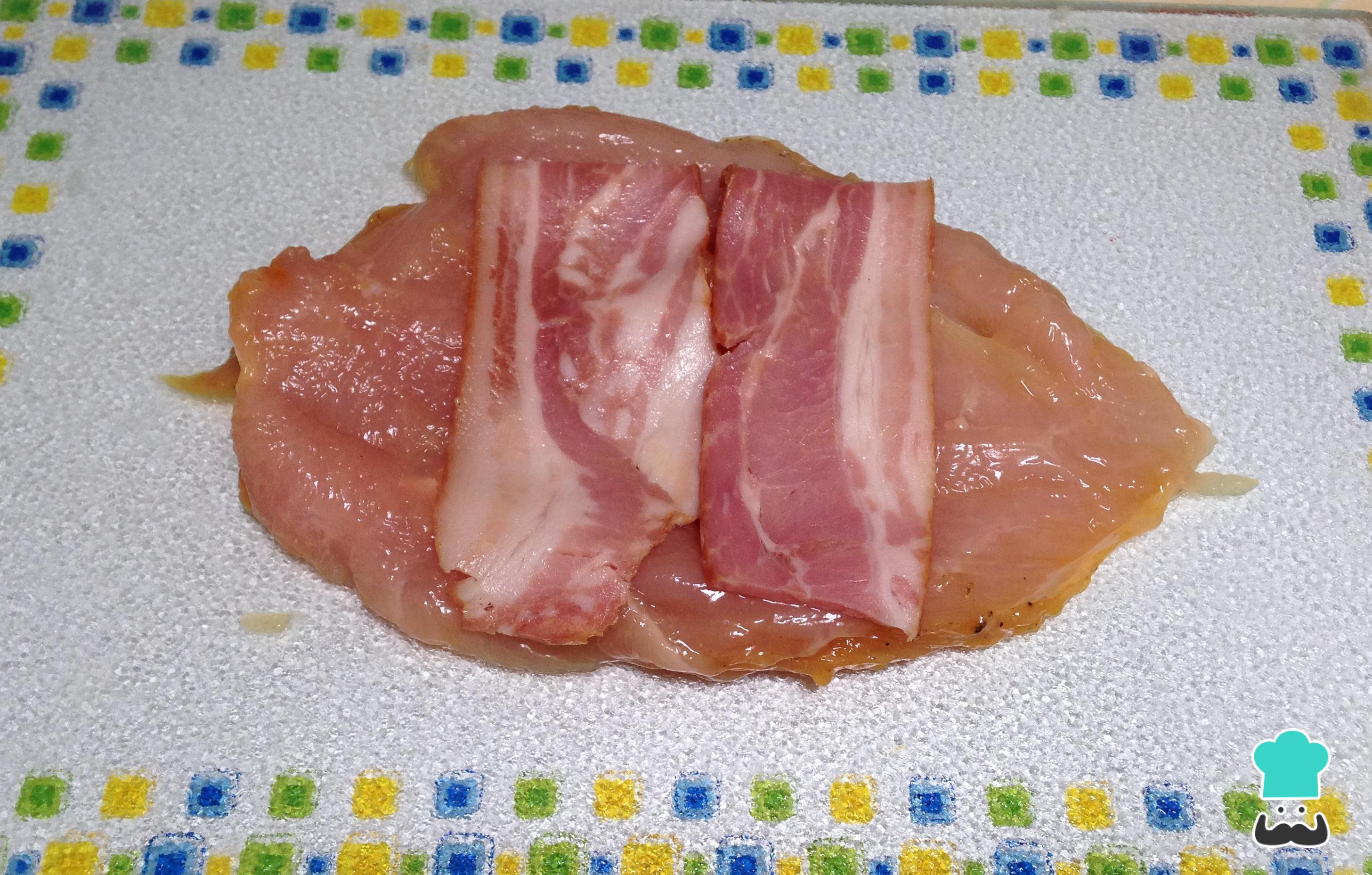 Abra o peito de frango ao peio e coloque no centro o bacon.