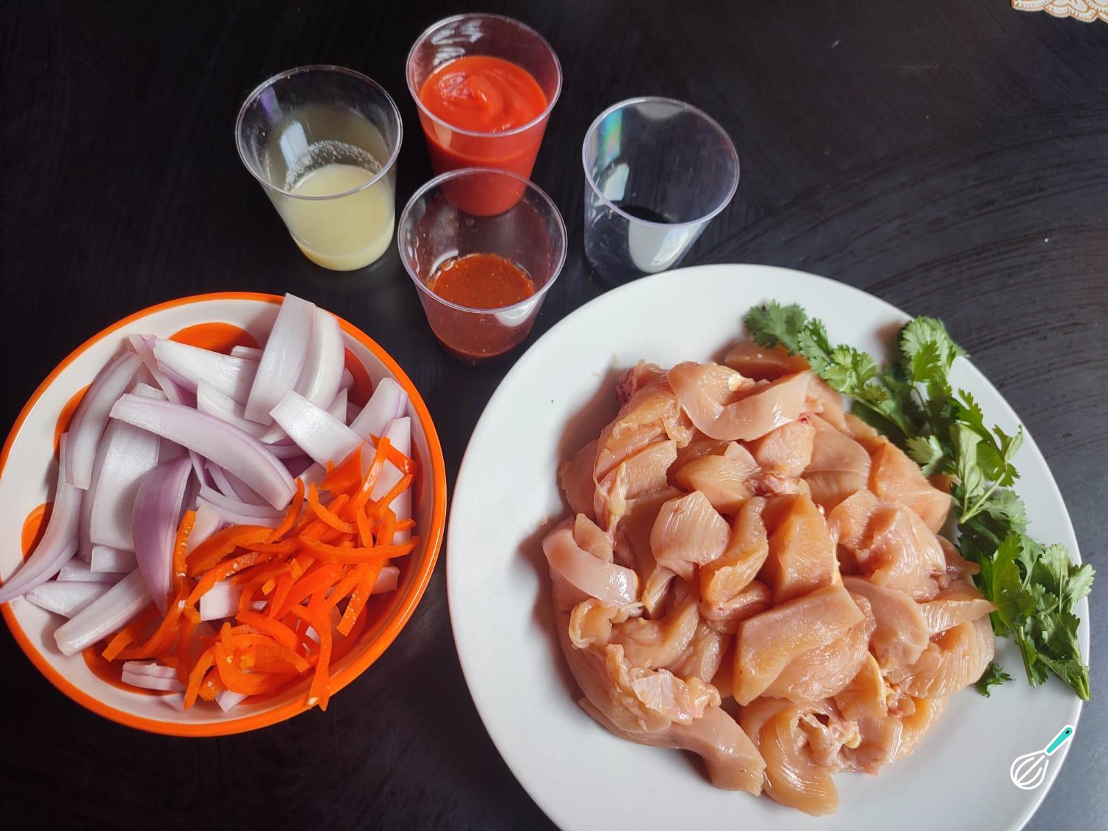 Para começar com a suculenta receita de peito frango peruano com molho, corte o peito de frango em pequenos cubos ou tiras. Em seguida, pique a cebola roxa em tiras ou ligeiramente largas, como você pode ver na foto. Depois, corte o pimentão amarelo em tiras e faça o mesmo com todos os outros ingredientes. Não vai demorar muito para terminar esta preparação.